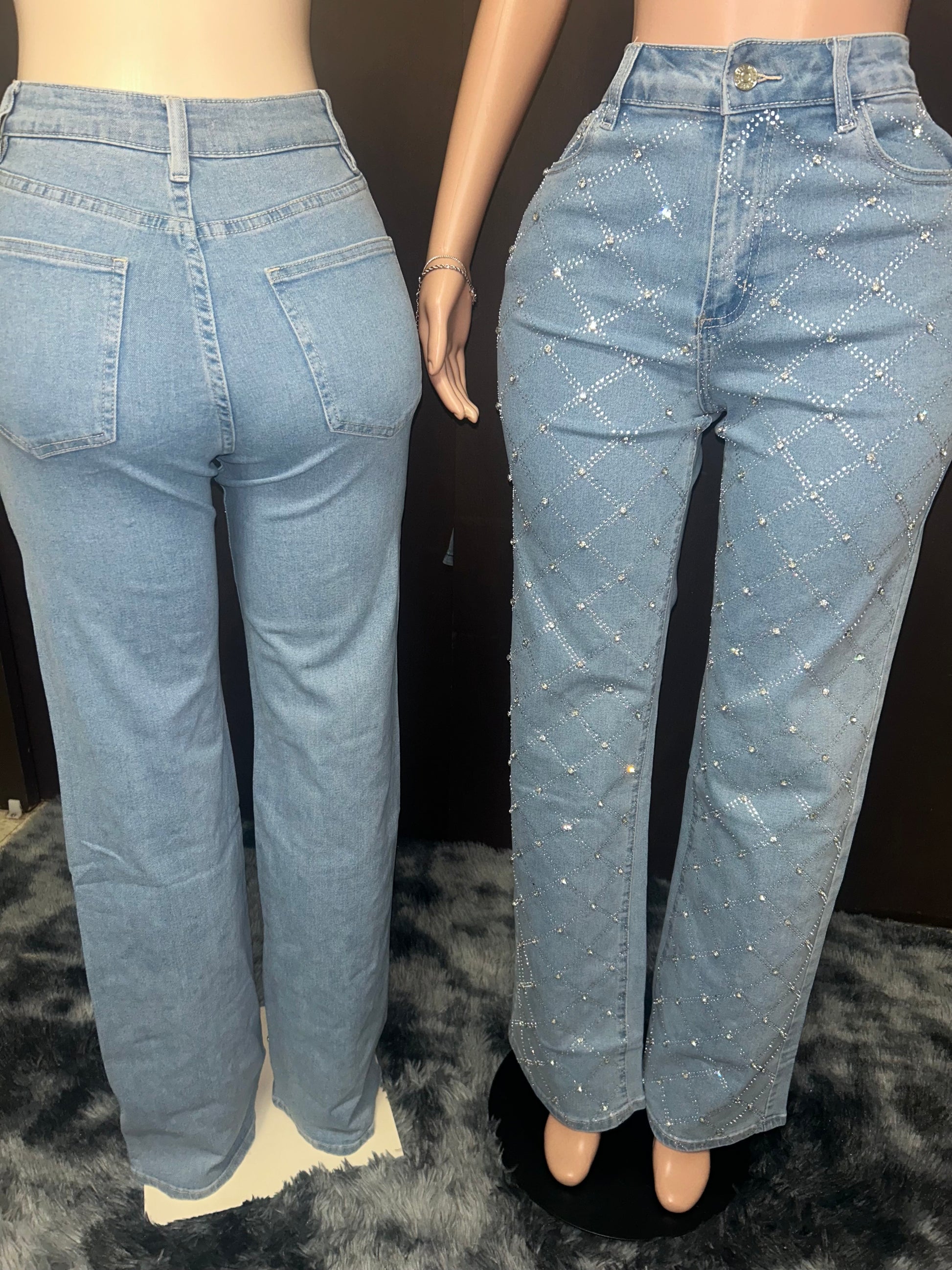 - Update your wardrobe with our stunning Semi-Stretch High-Waisted Jeans! These statement jeans feature a button closure and rhinestone detailing, making them the perfect mix of comfort and glamour. With a wide-leg and 35 inch inseam, these jeans elongate your silhouette while the 60% cotton, 27% polyester, 11% viscose, and 2% elastane blend ensures a comfortable fit.