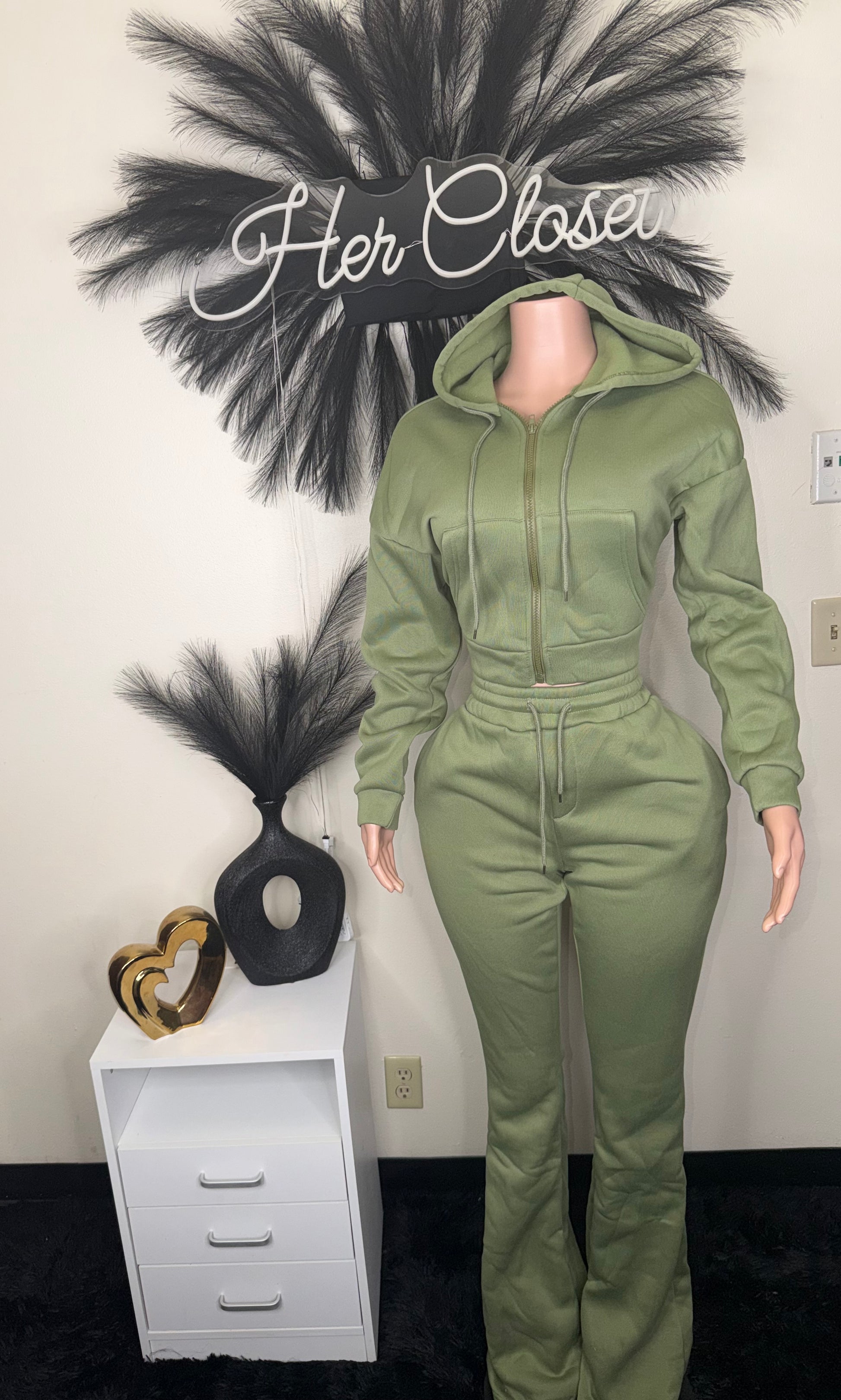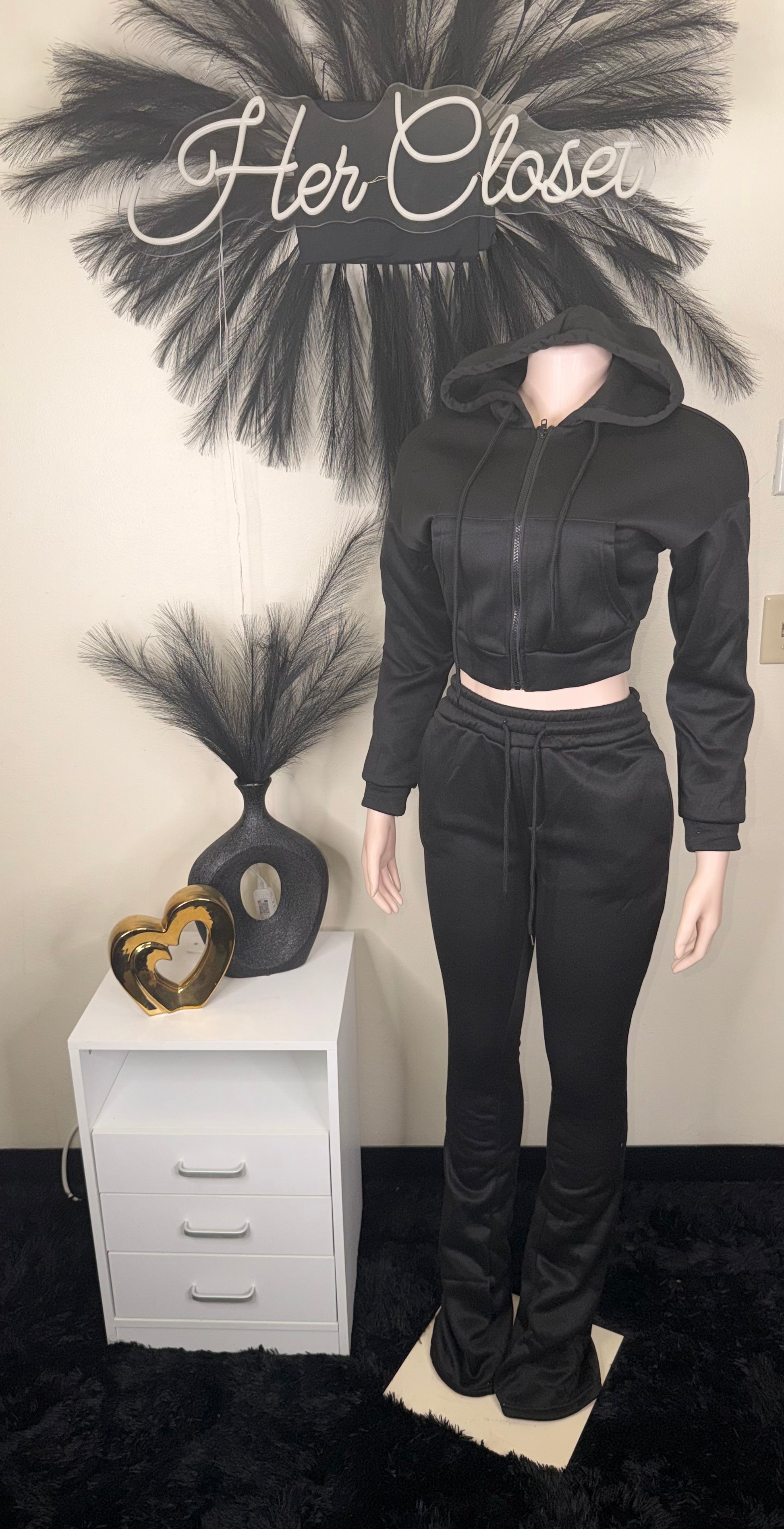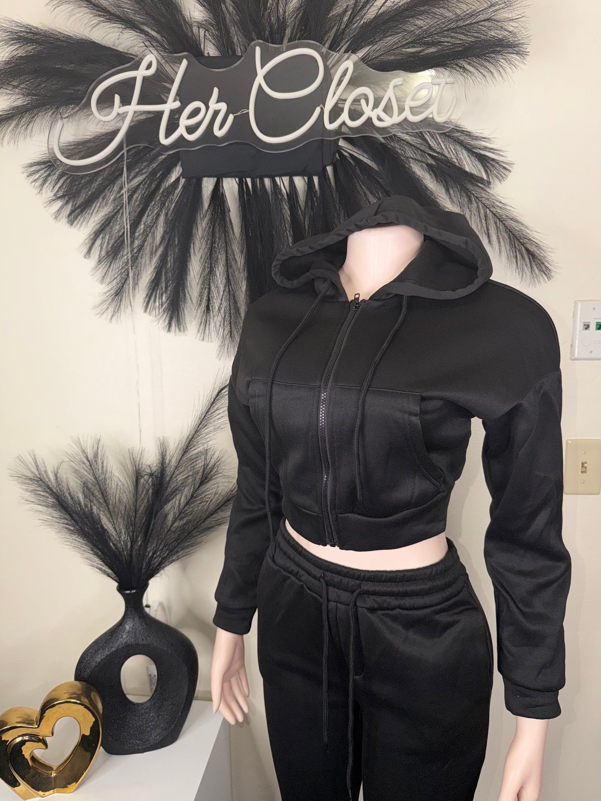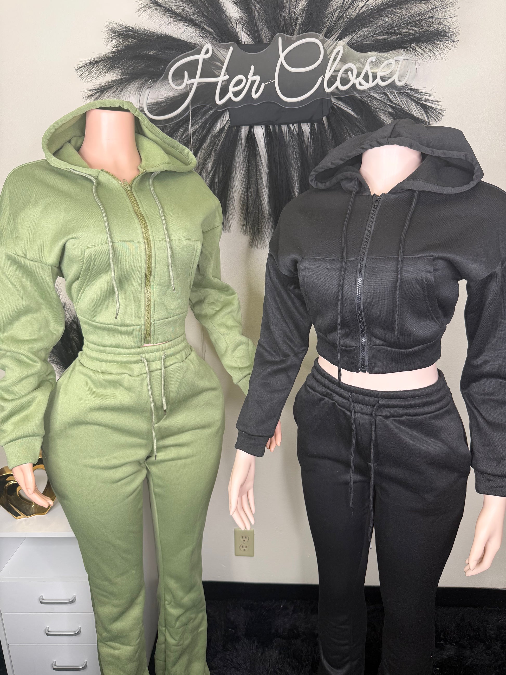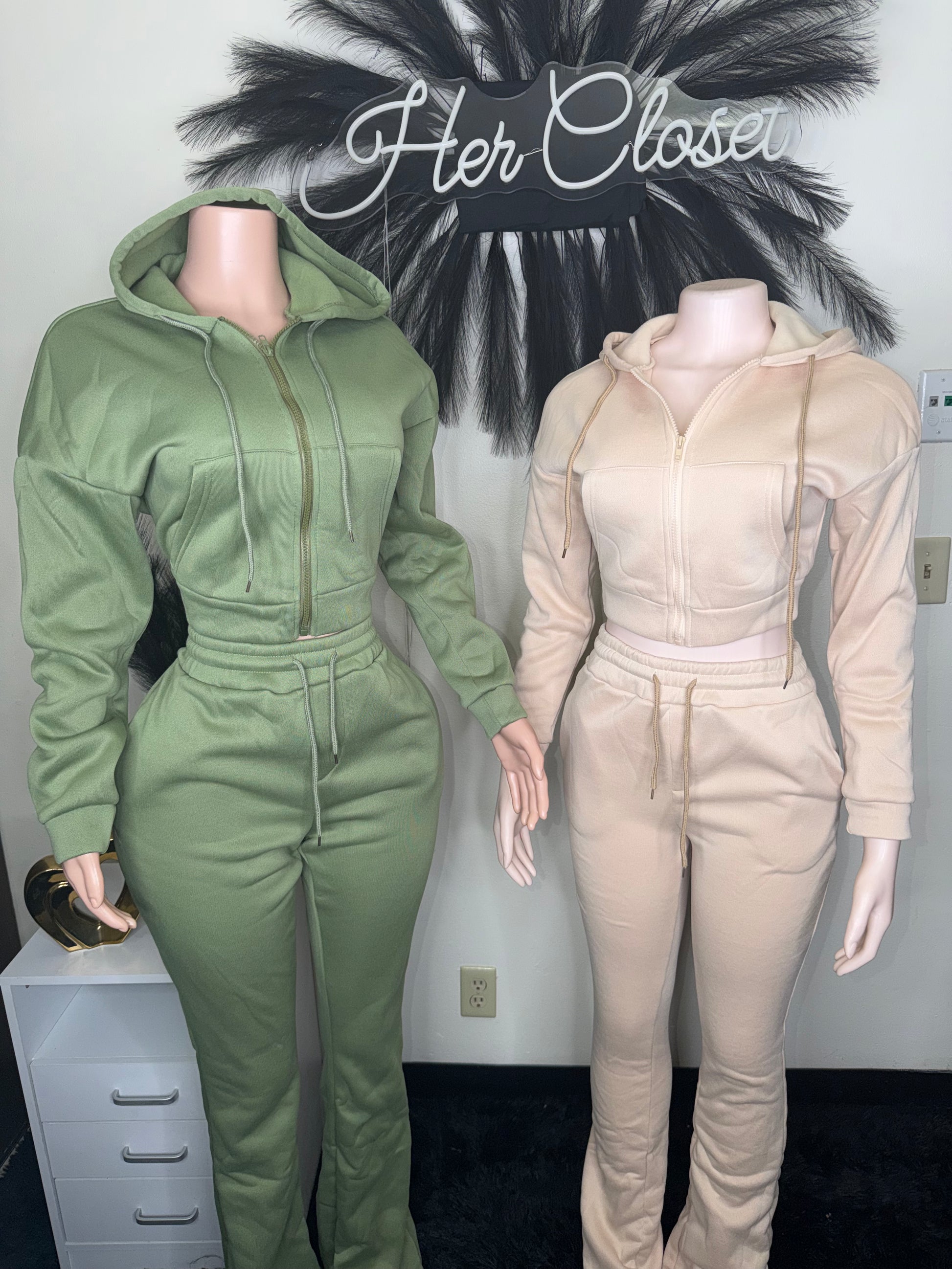 Cozy cotton joggers featuring drawstrings and front pockets on both the hoodie and pants. These joggers are designed for a stylish stacked look.