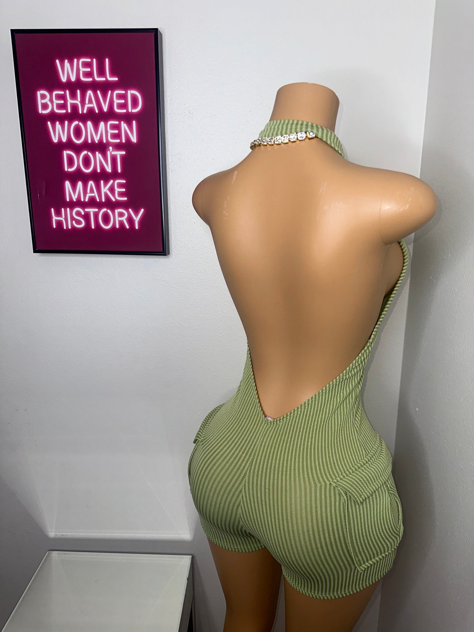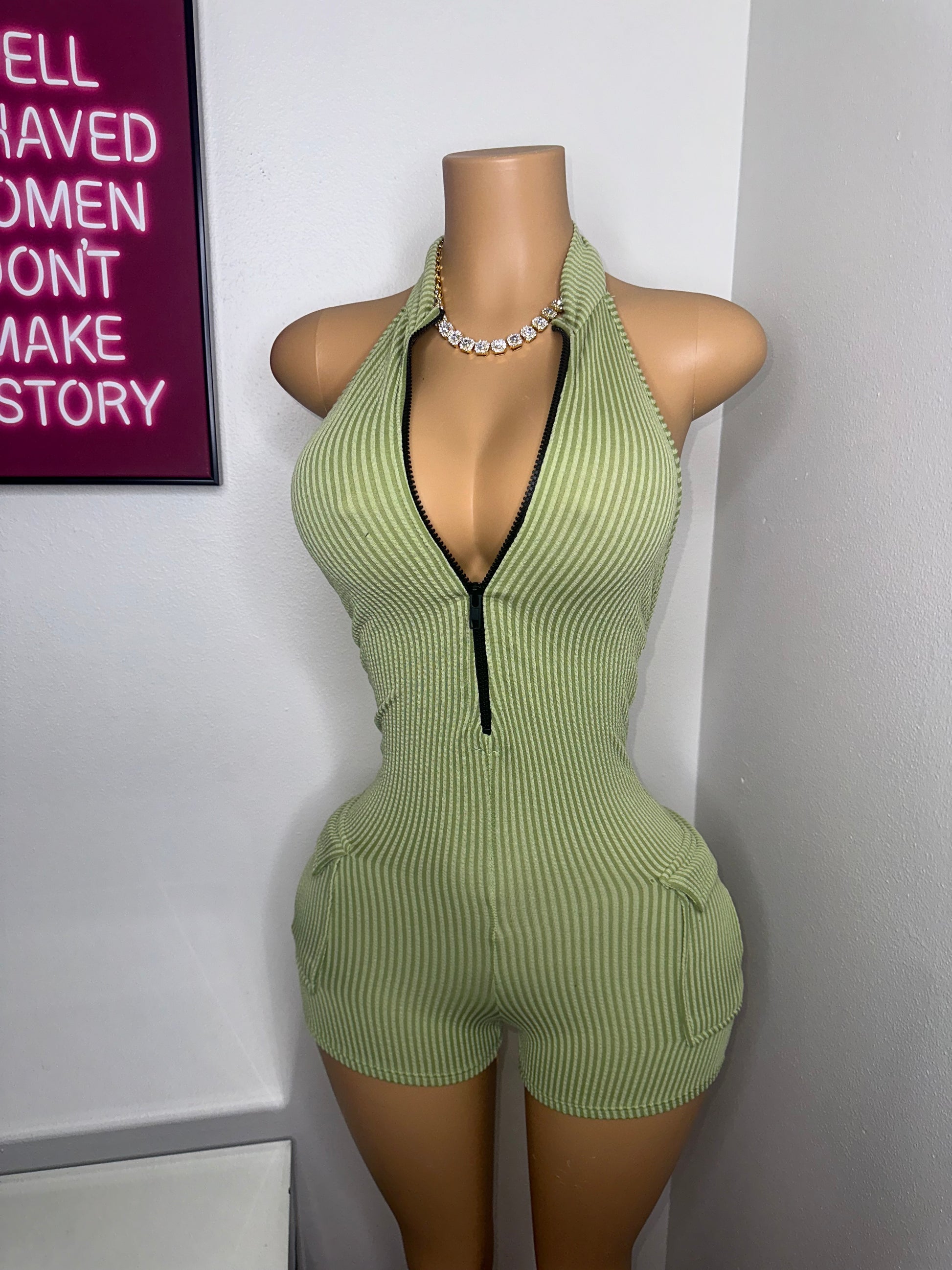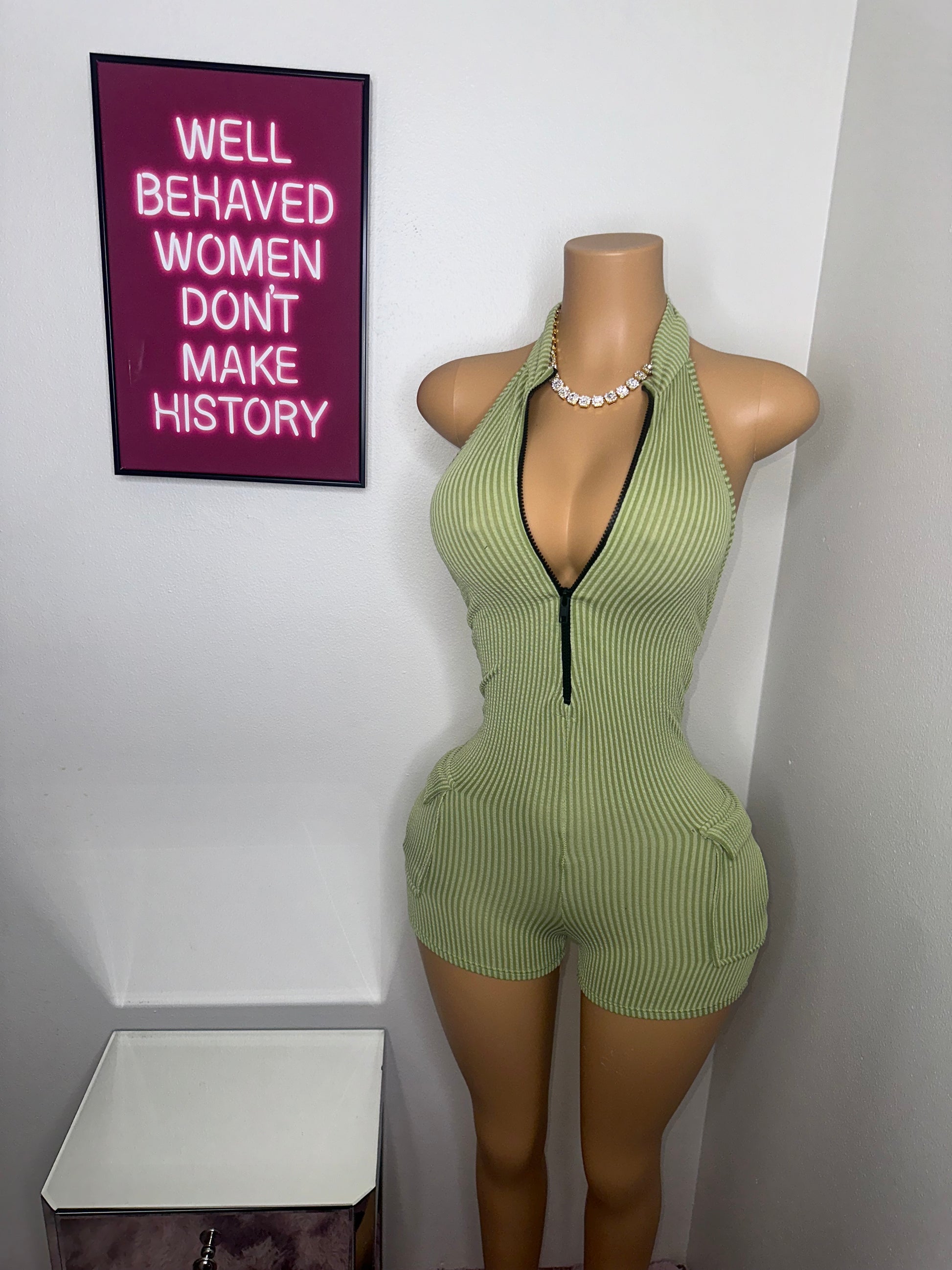 Mannequin is wearing a size small in the jumpsuit. (GREEN & BLACK RUNS A LITTLE SMALL). The Bodied Halter Romper features a stretchy fabric blend of 76% polyester, 21% rayon, and 3% spandex. Its halter style with a mock neck and a zipper create a chic and comfortable look.
