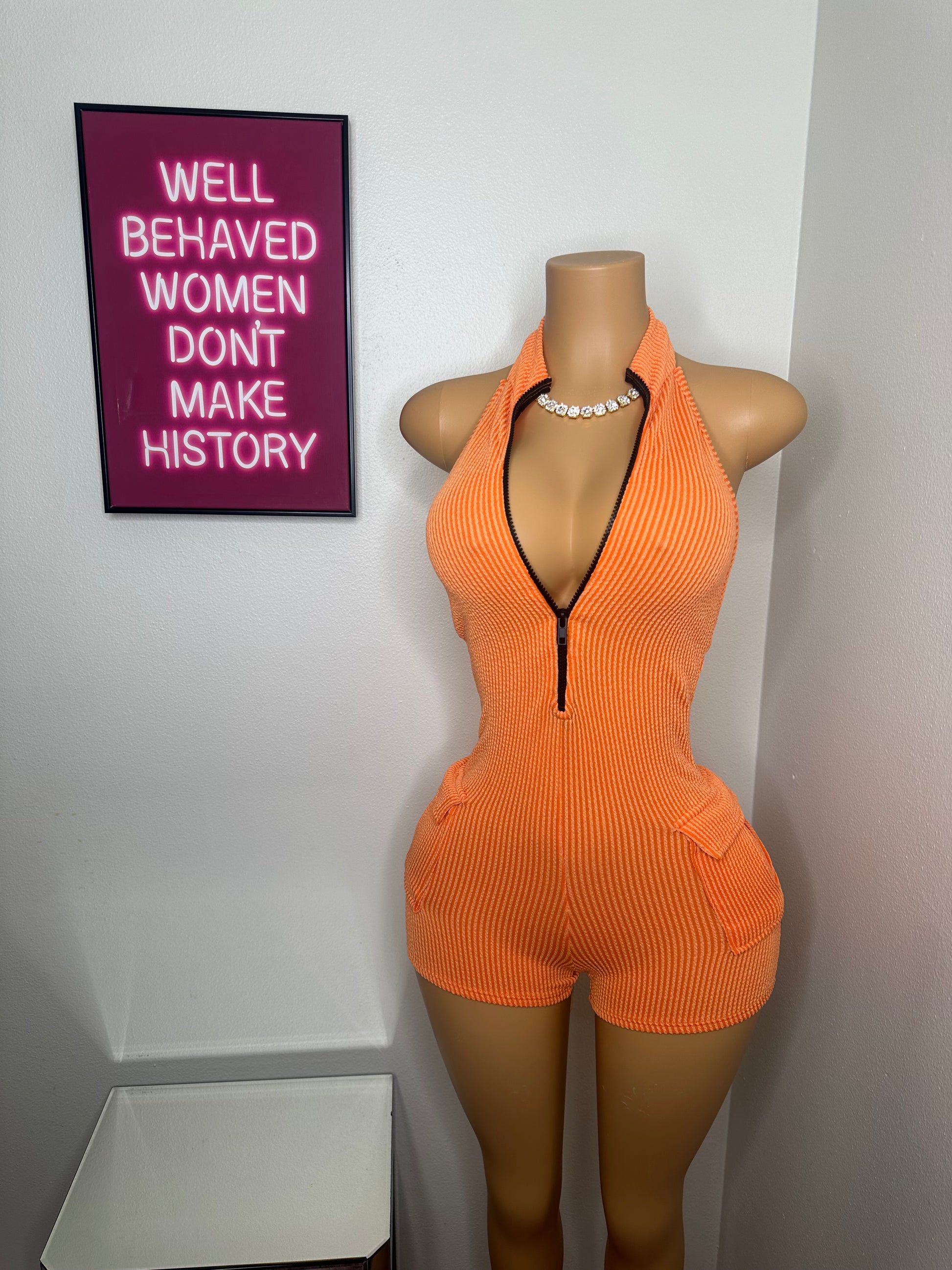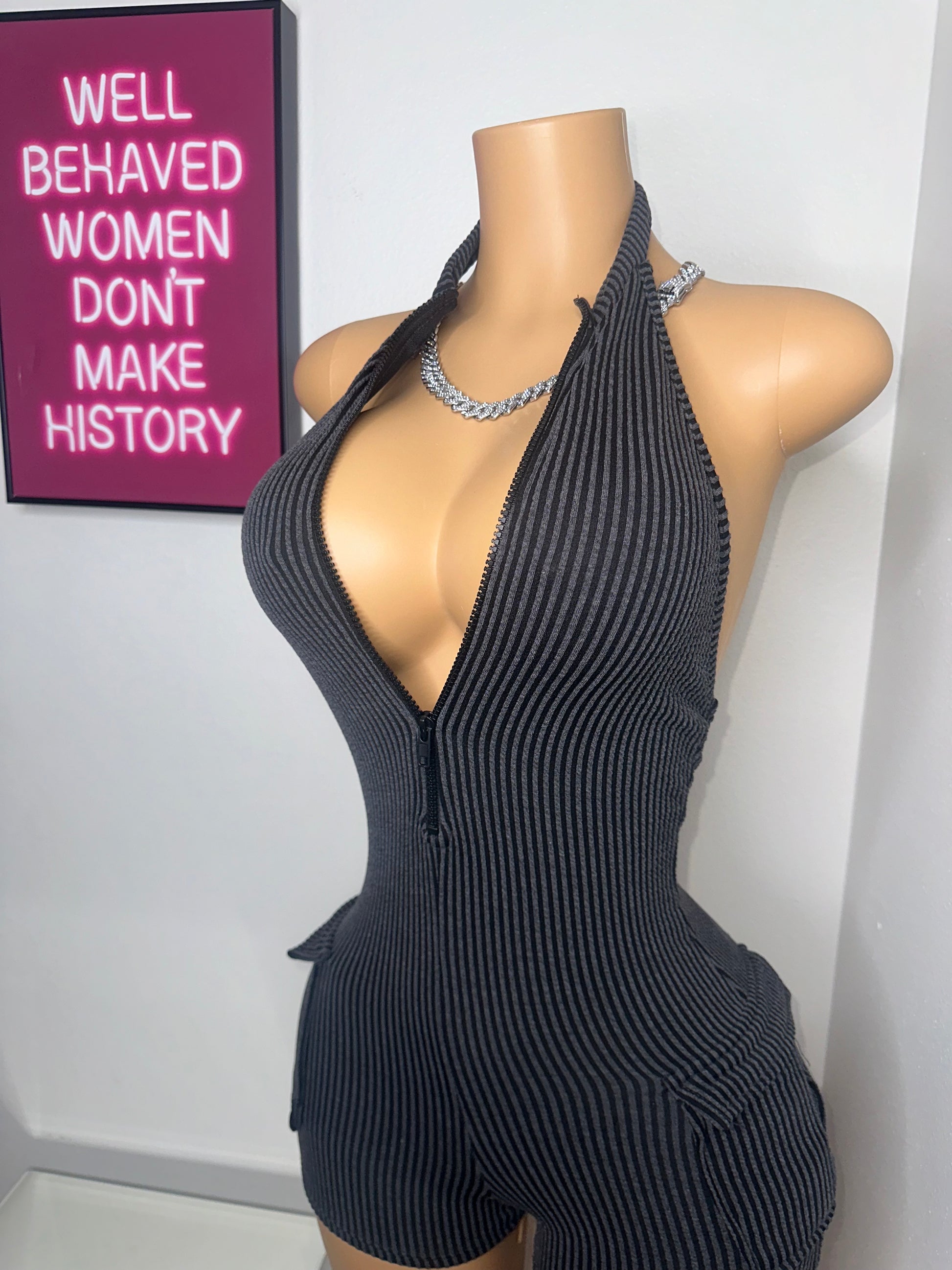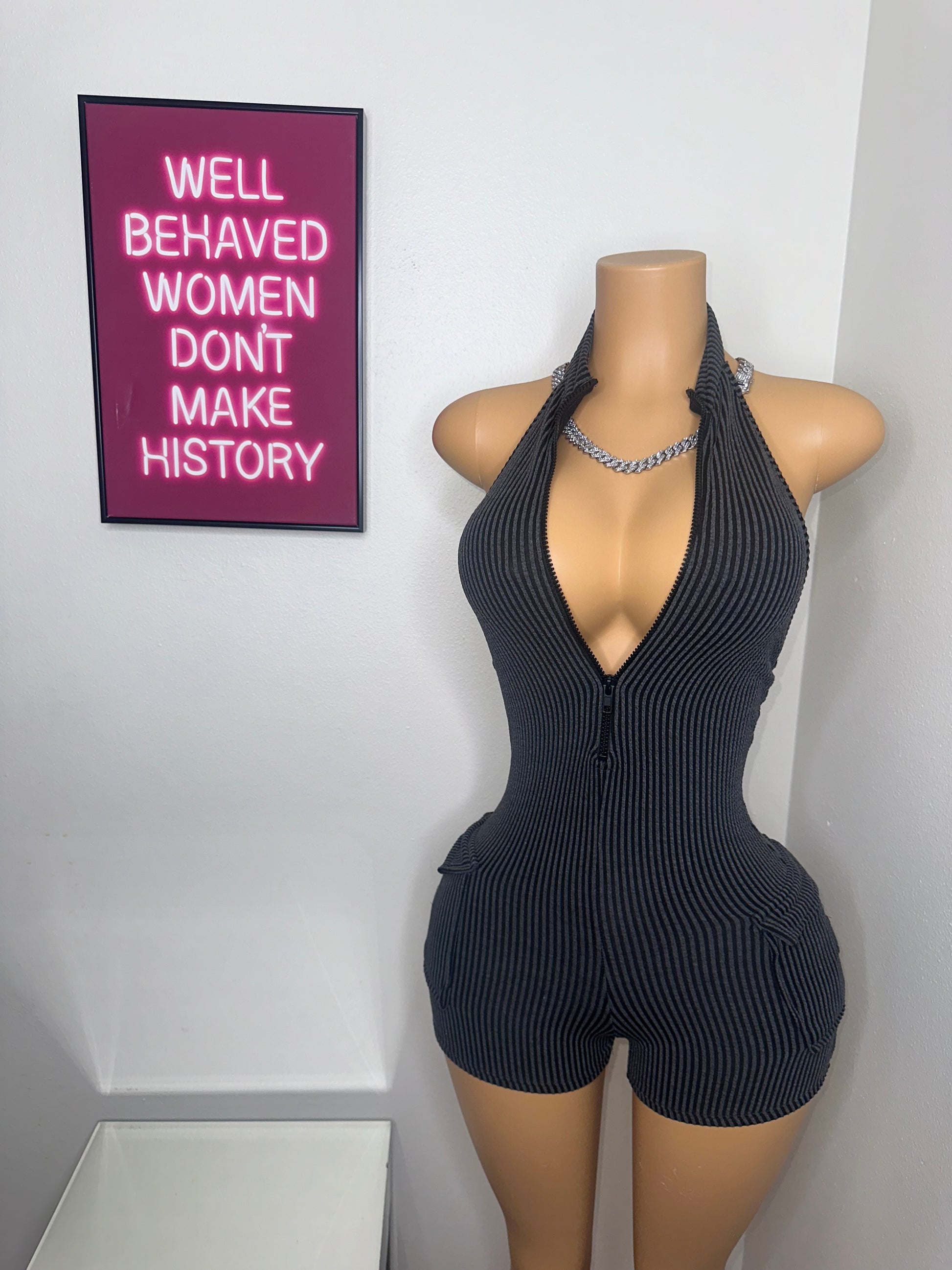 Mannequin is wearing a size small in the jumpsuit. (GREEN & BLACK RUNS A LITTLE SMALL). The Bodied Halter Romper features a stretchy fabric blend of 76% polyester, 21% rayon, and 3% spandex. Its halter style with a mock neck and a zipper create a chic and comfortable look.