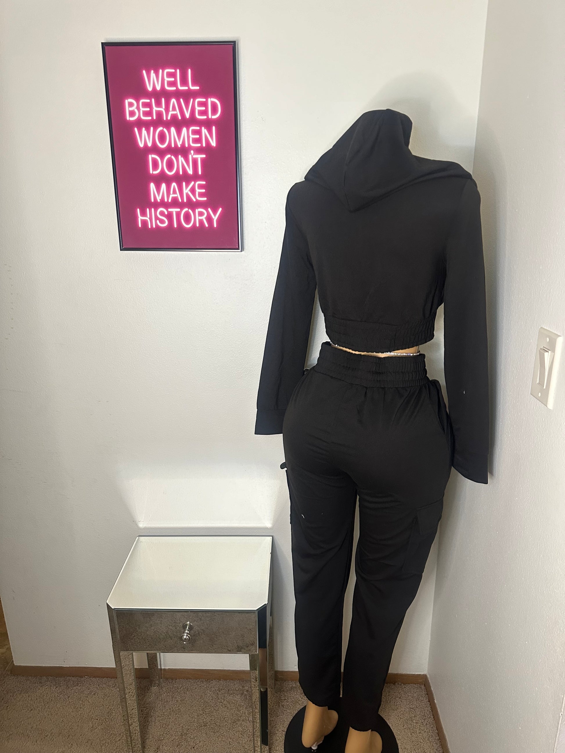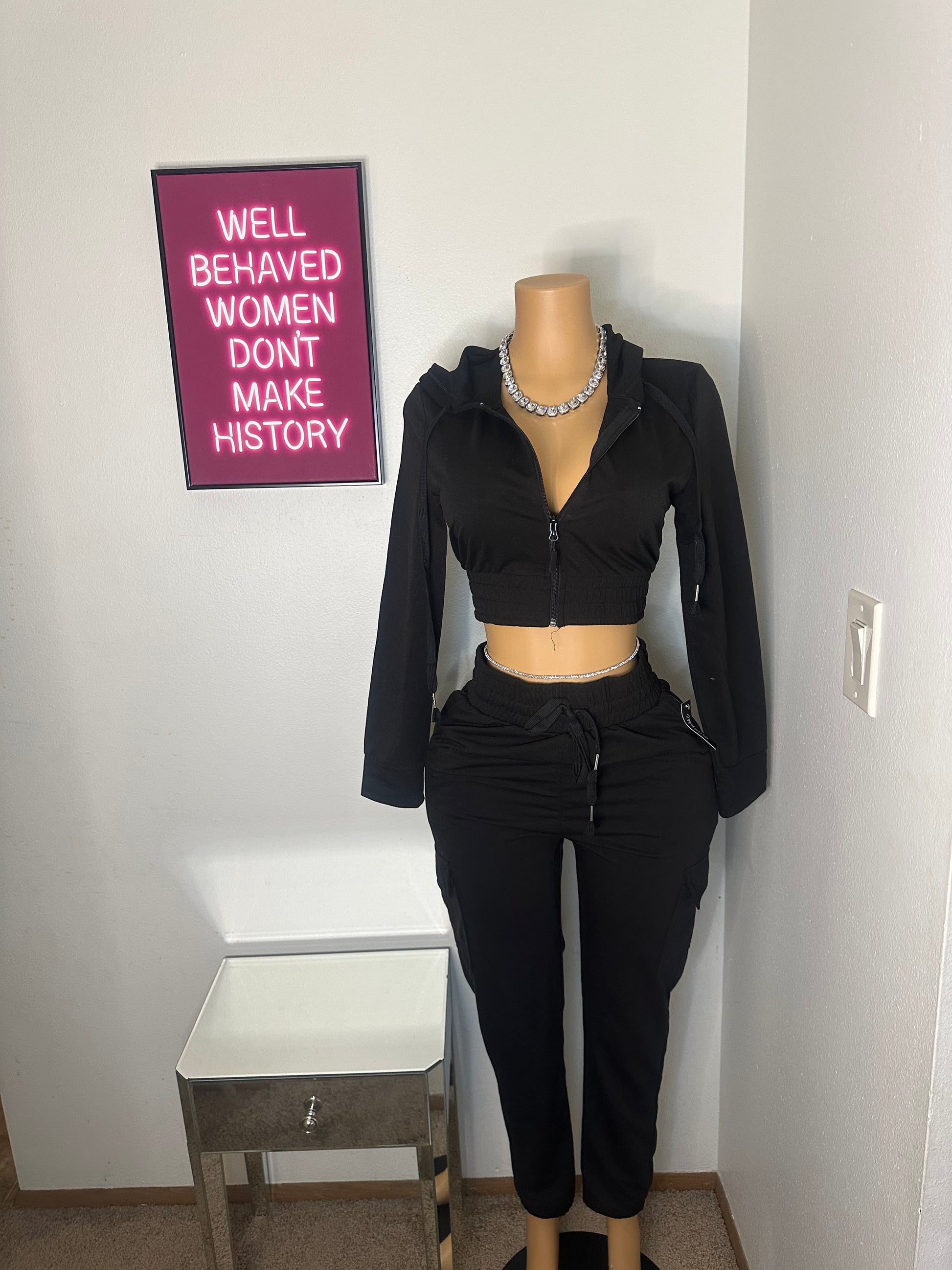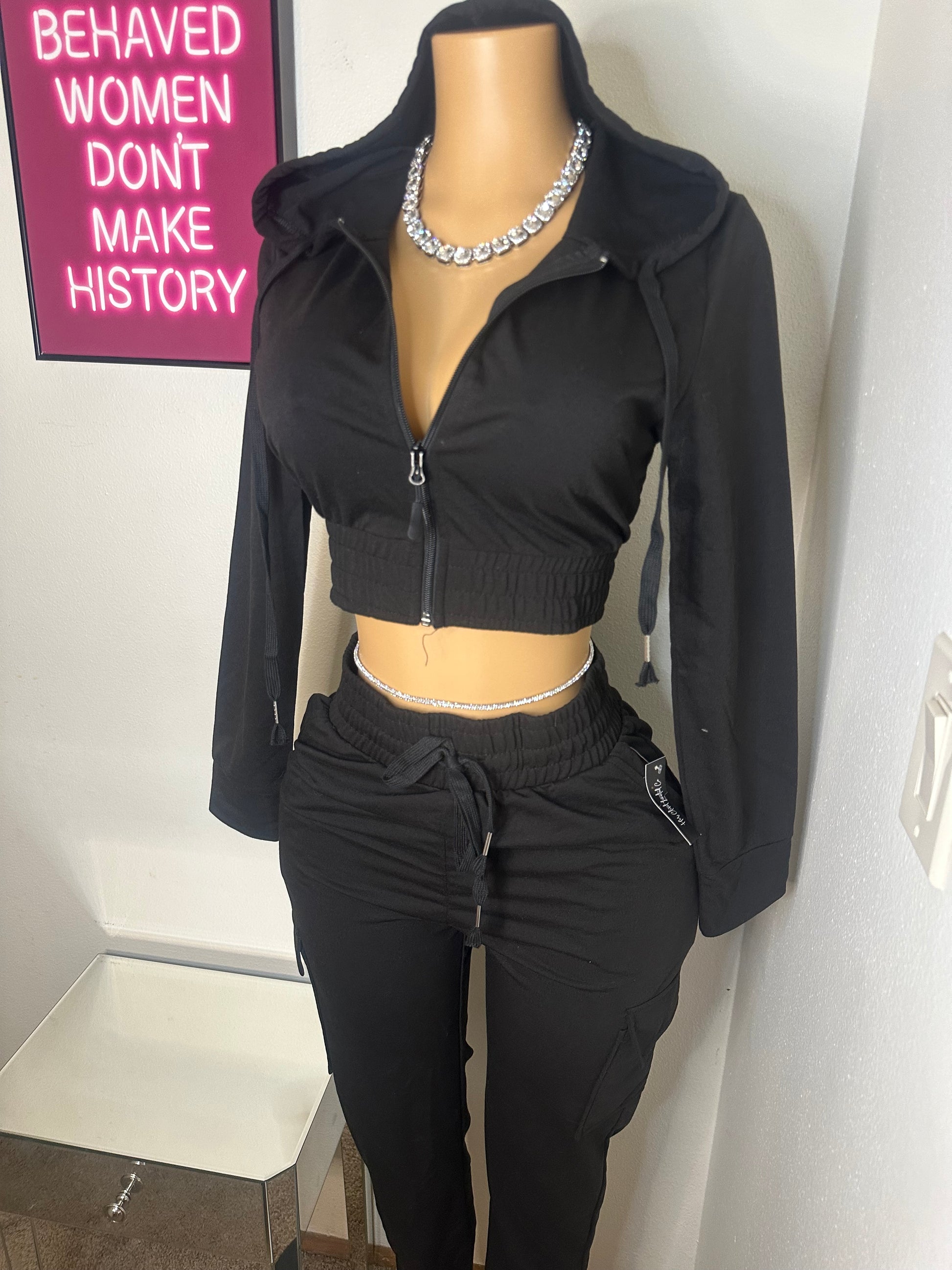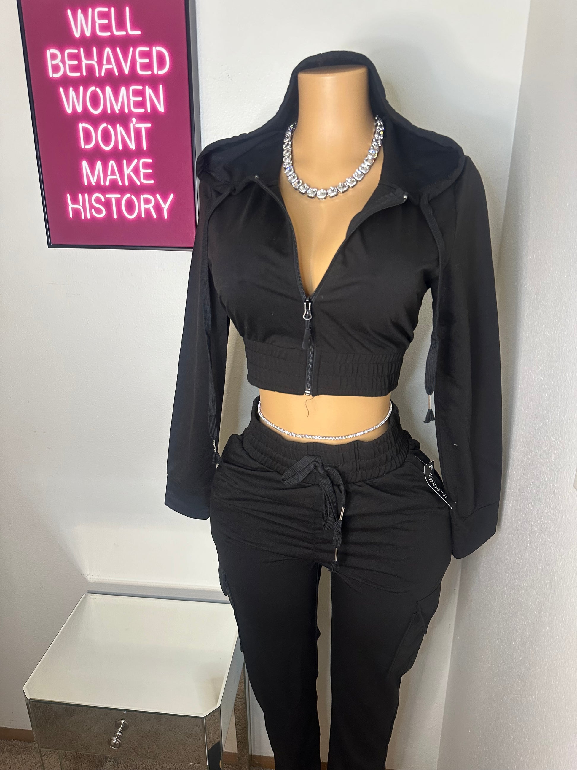 SOLID COLOR FRENCH TERRY HOODIE ZIP UP CROP TOP AND CARGO JOGGER SET.