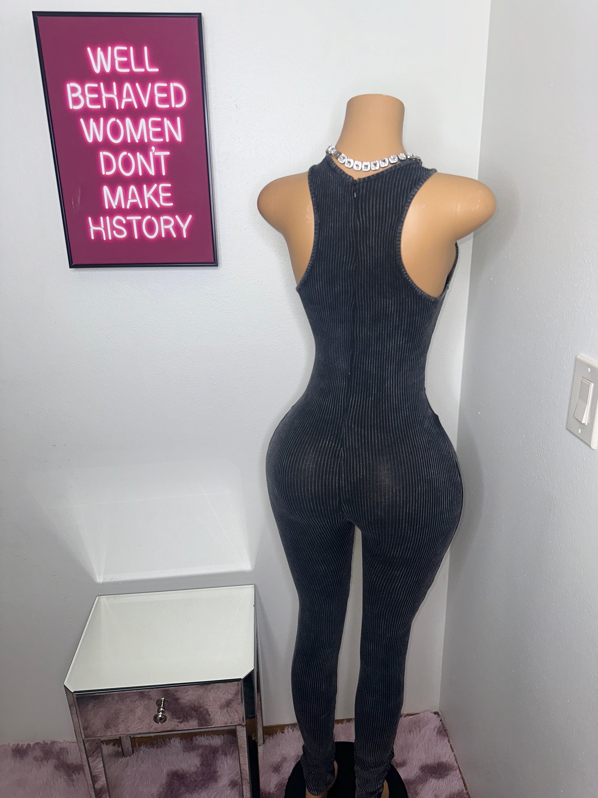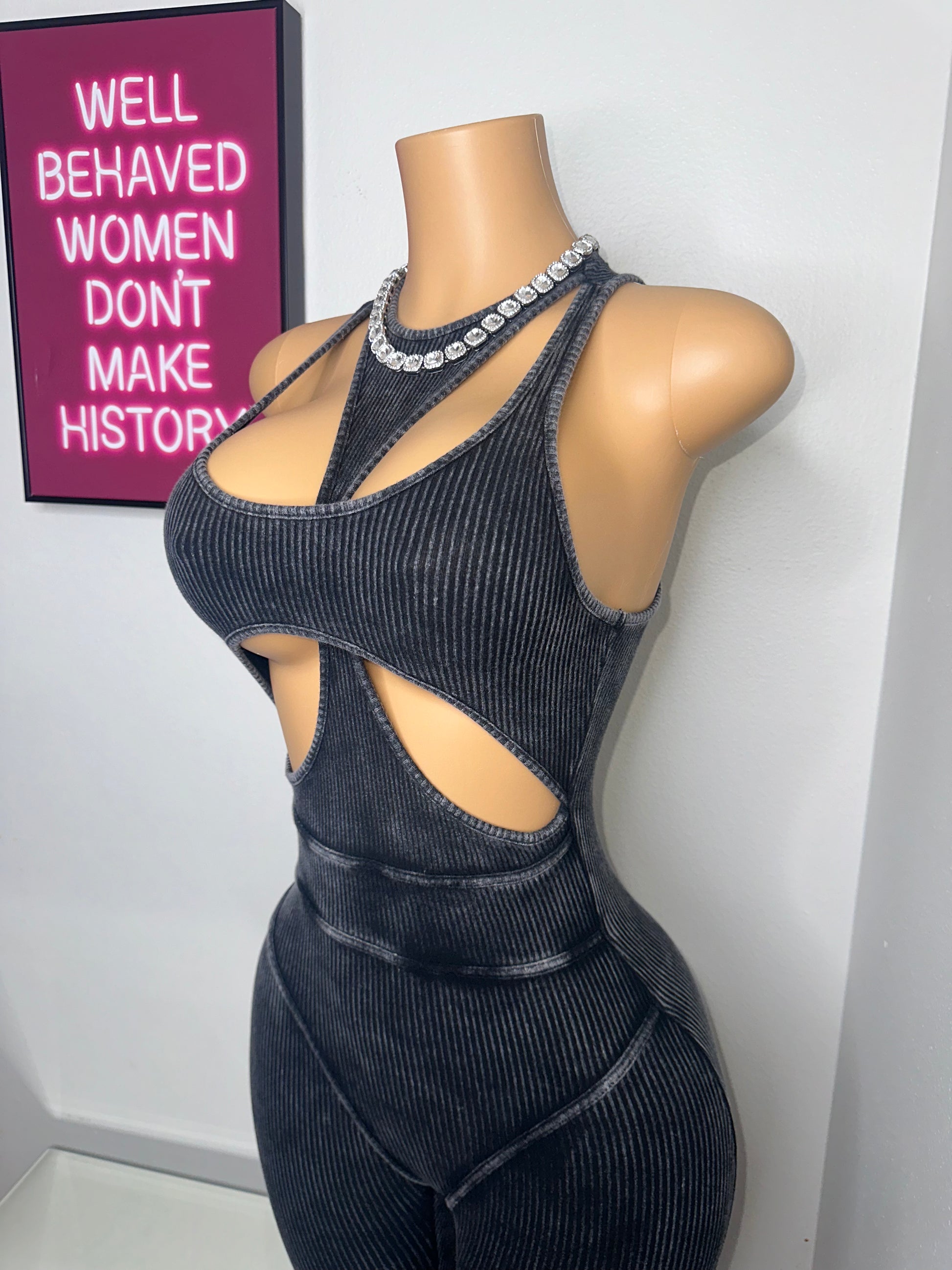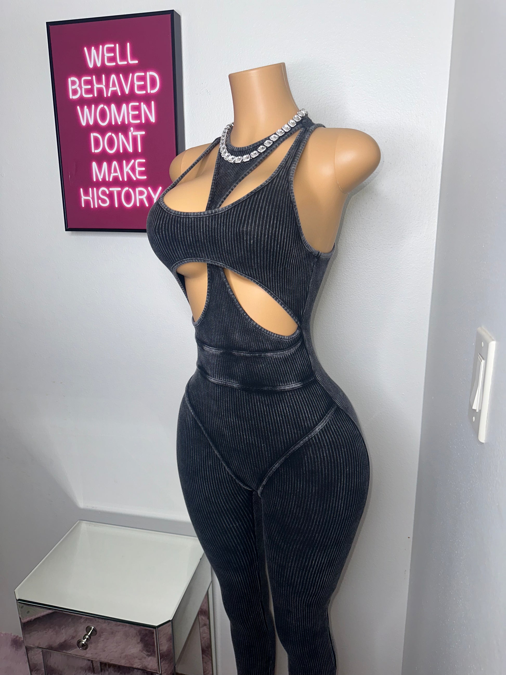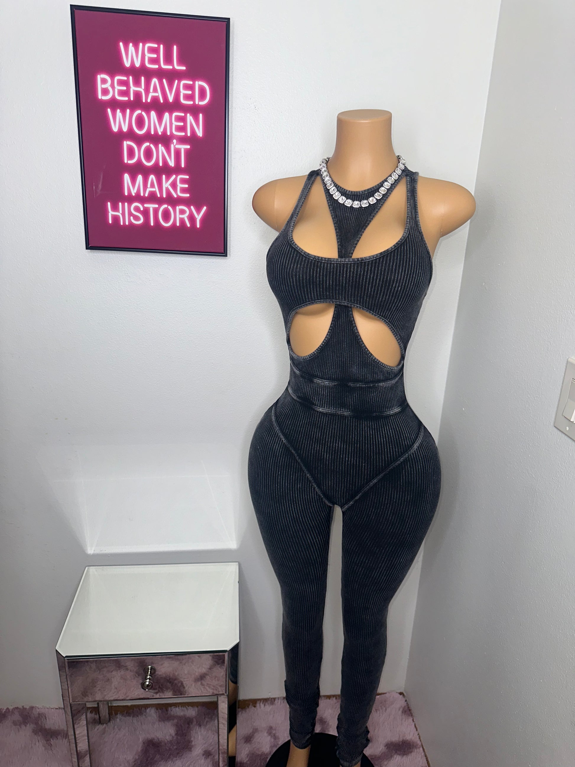 - Mannequin is wearing a small. The Something Exotic Jumpsuit is Constructed from a blend of 96% polyester and 4% spandex, this stretch jumpsuit boasts a round neckline and cutout design. The sleeveless design provides comfort and freedom of movement, while the inseam measures at 30 inches.