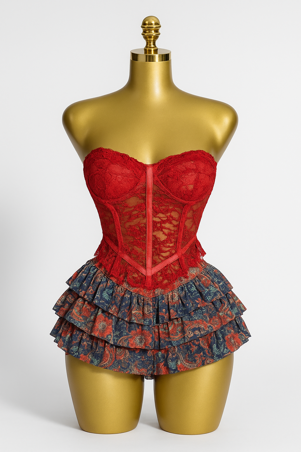 The Lylah Short Set features a strapless corset top and shorts, offering a snug and flattering fit. The fabric is not as stretchy as other materials, so it is recommended to size up for a comfortable and true-to-size fit.