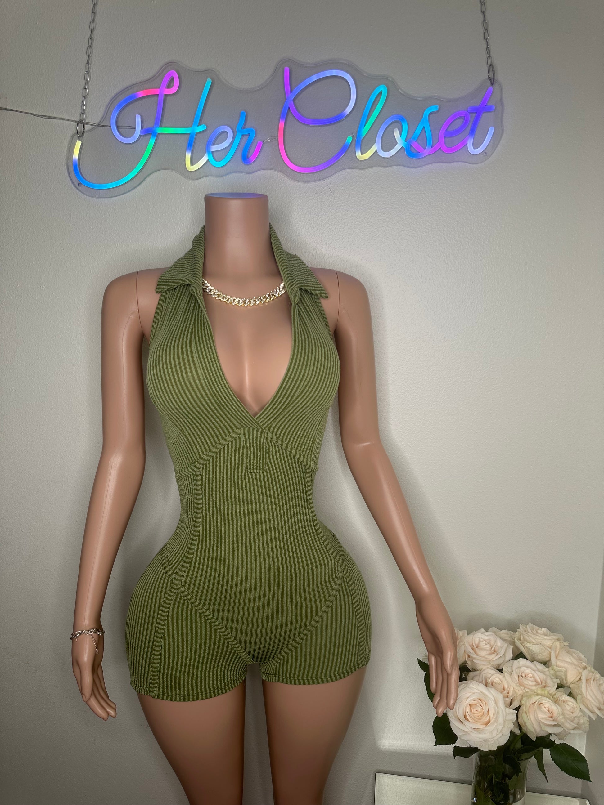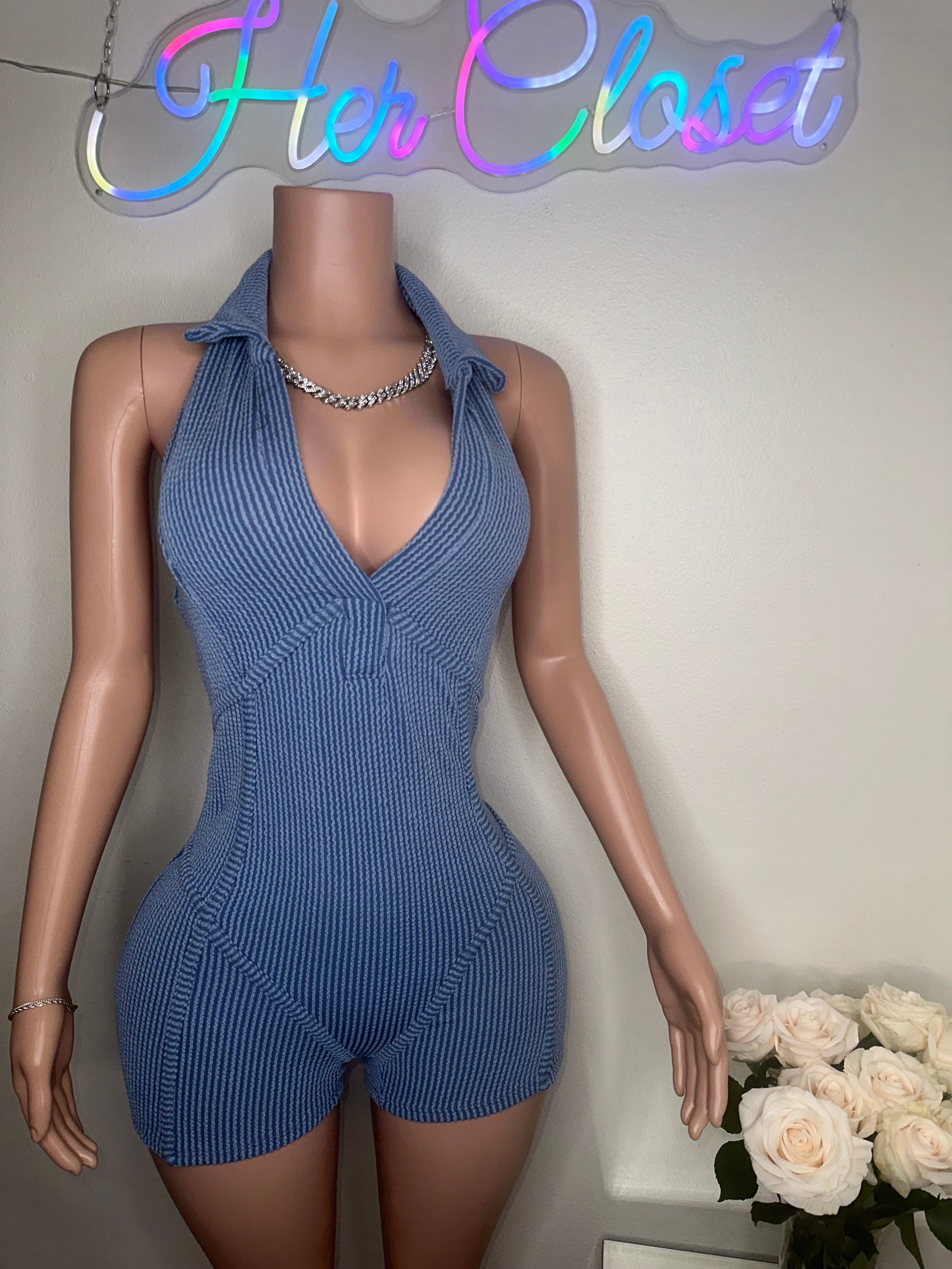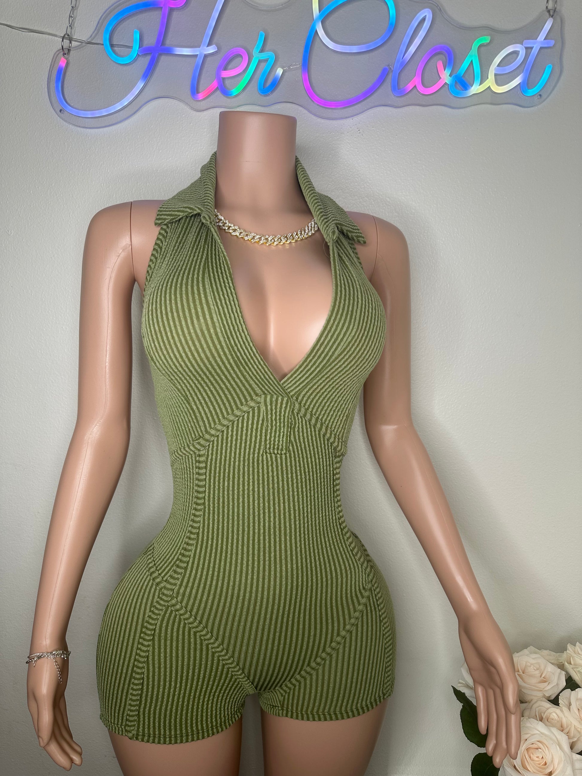 - This romper features a halter collar with a V-neck design and is made from a blend of 76% polyester, 21% rayon, and 3% spandex. It is recommended to hand wash in cold water. The mannequin in the photo is wearing a size small.