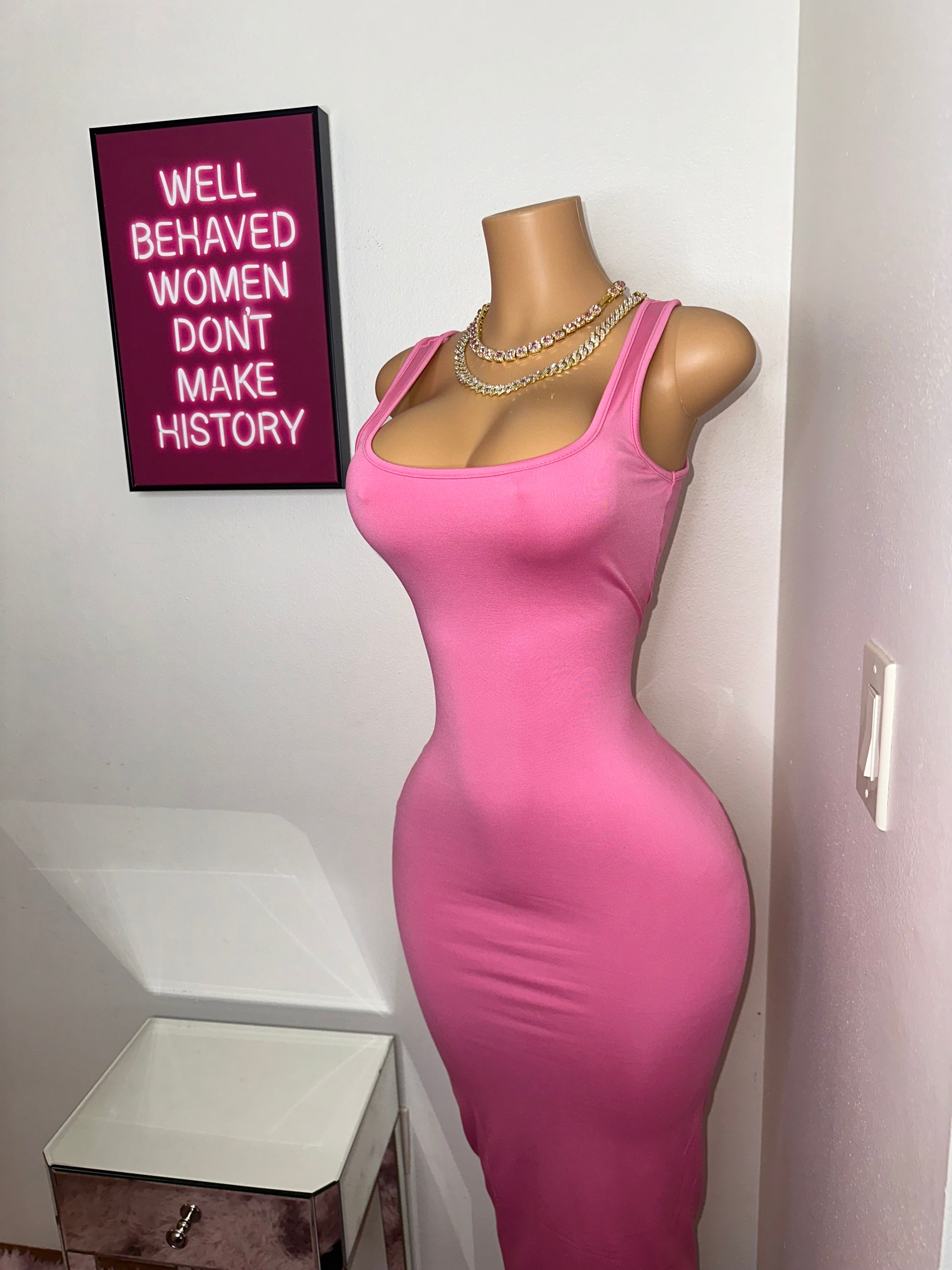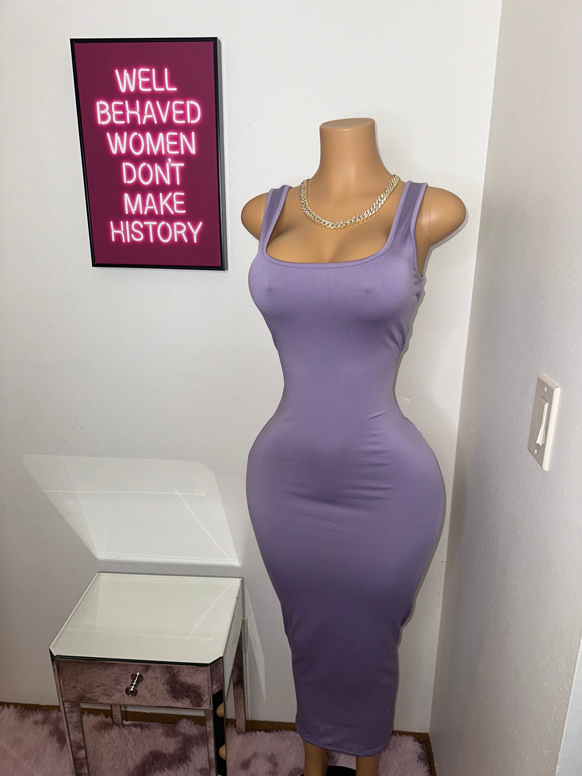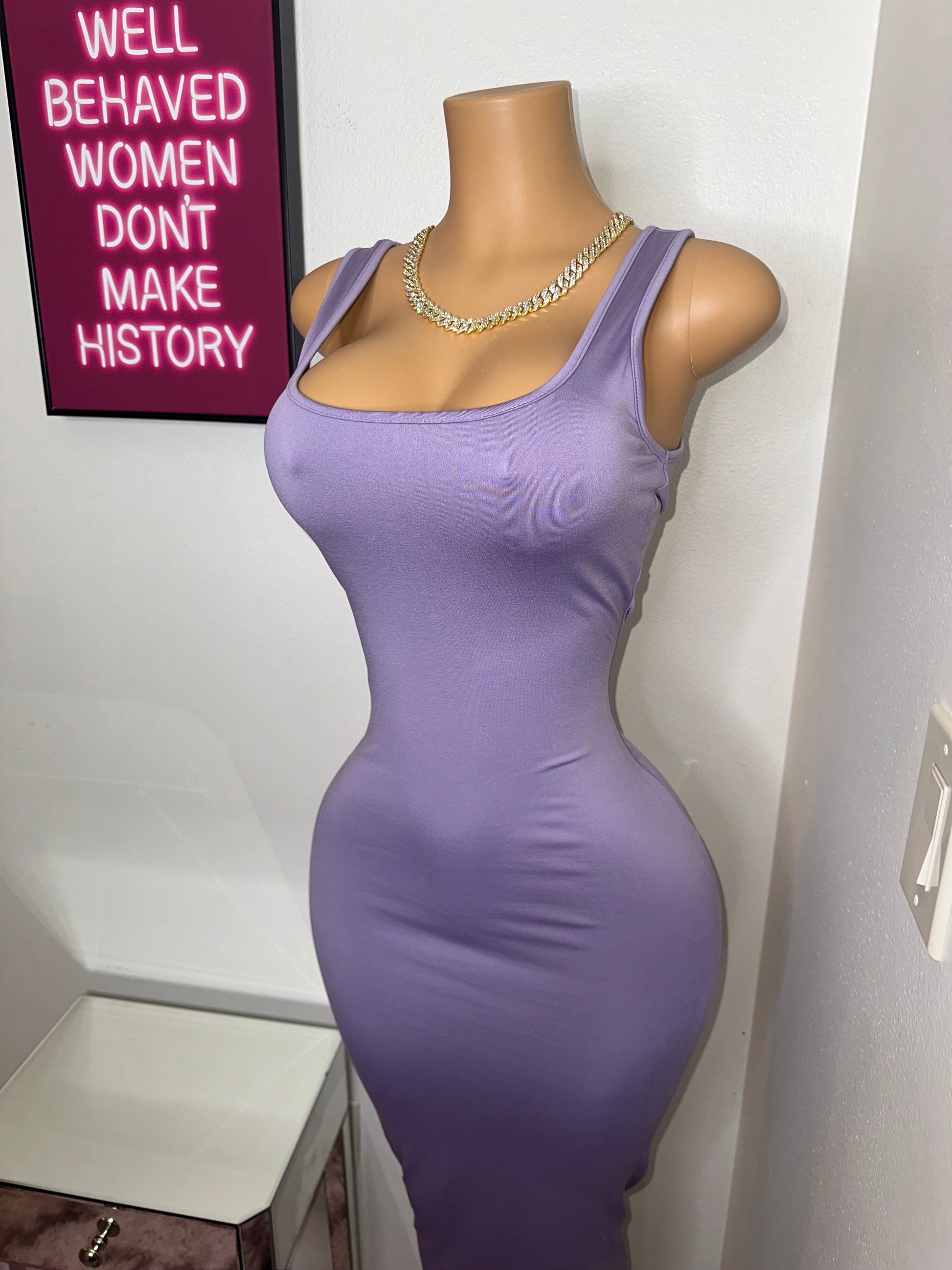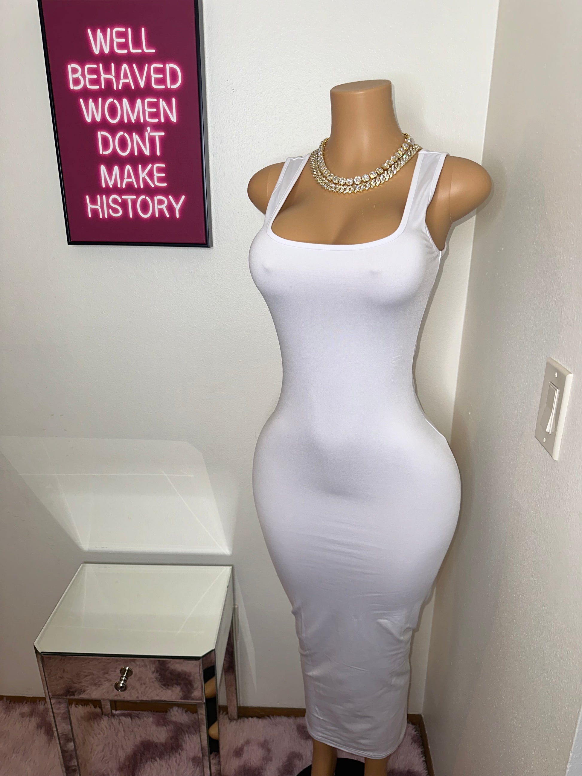 The dress fits a size small mannequin with room to spare. For a more snug fit, consider sizing down!