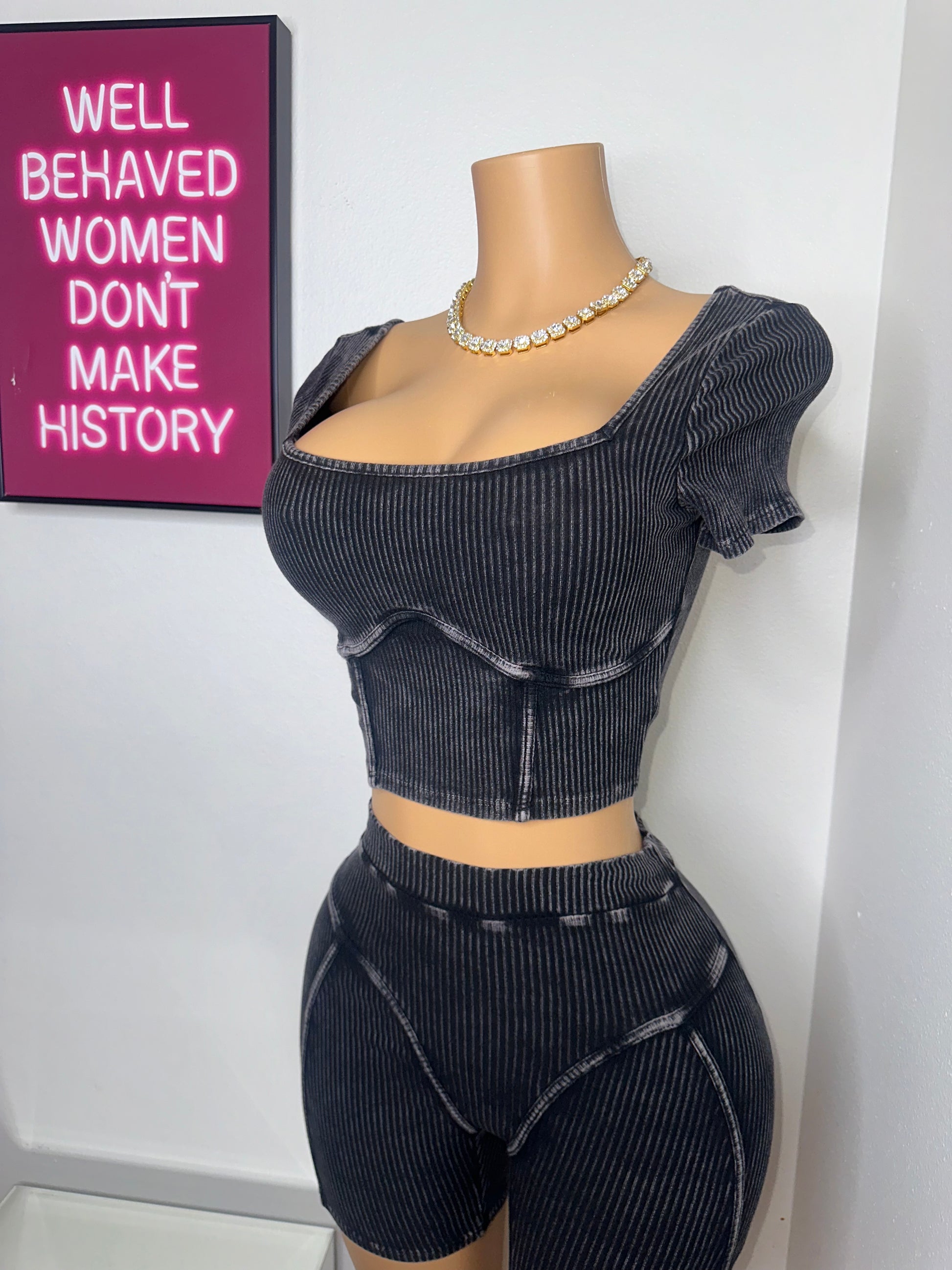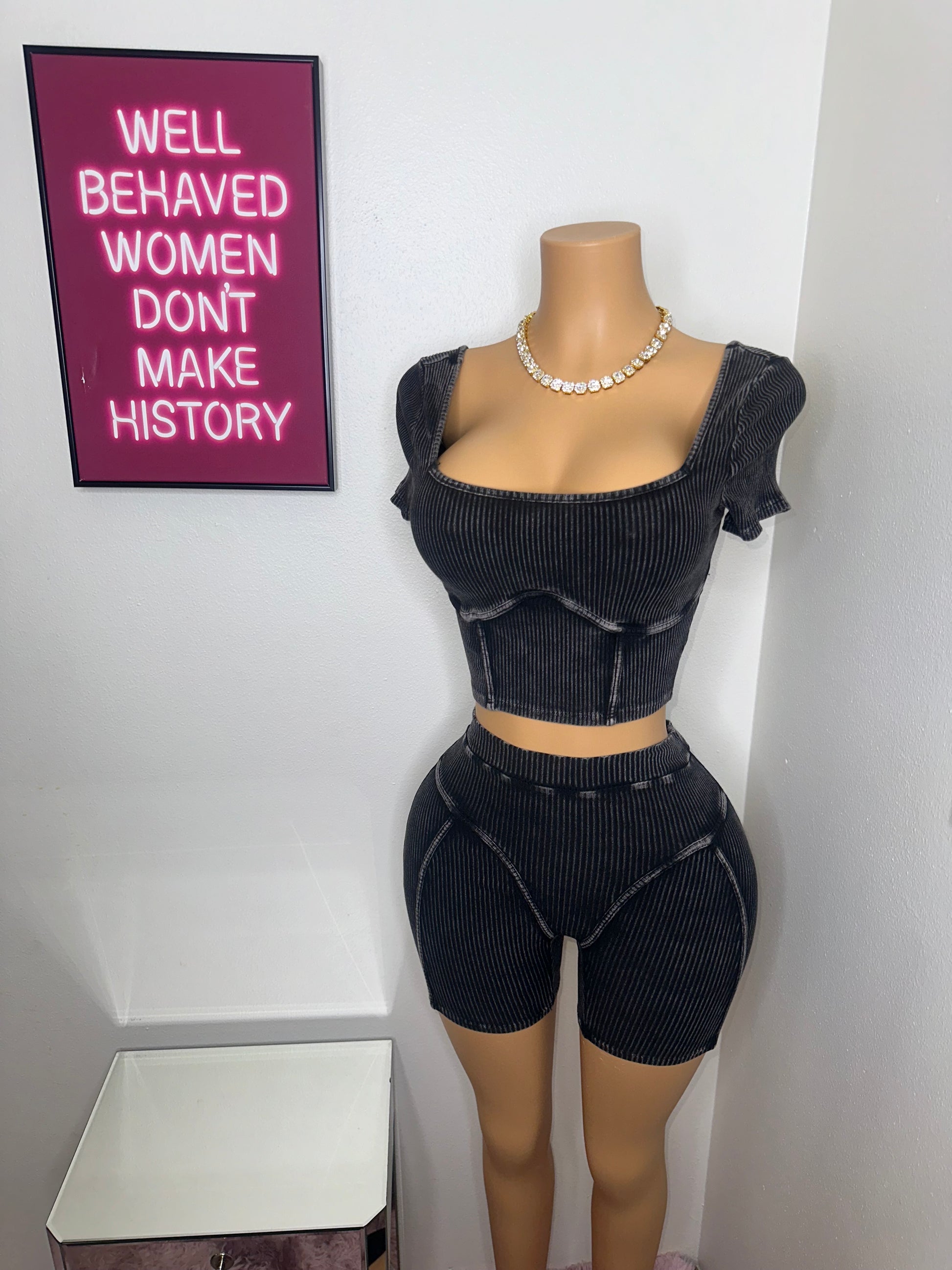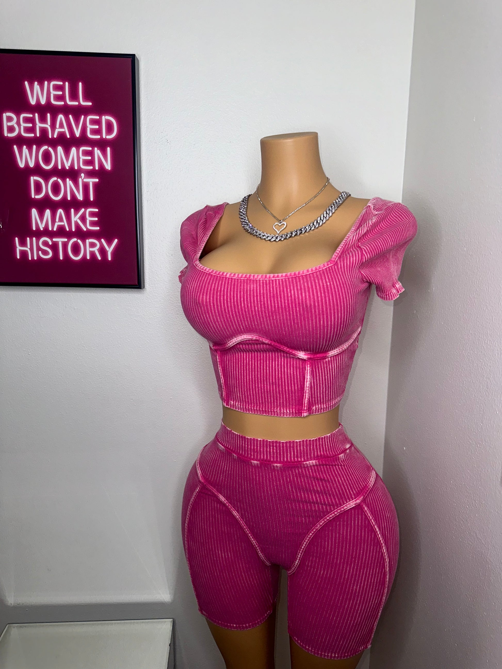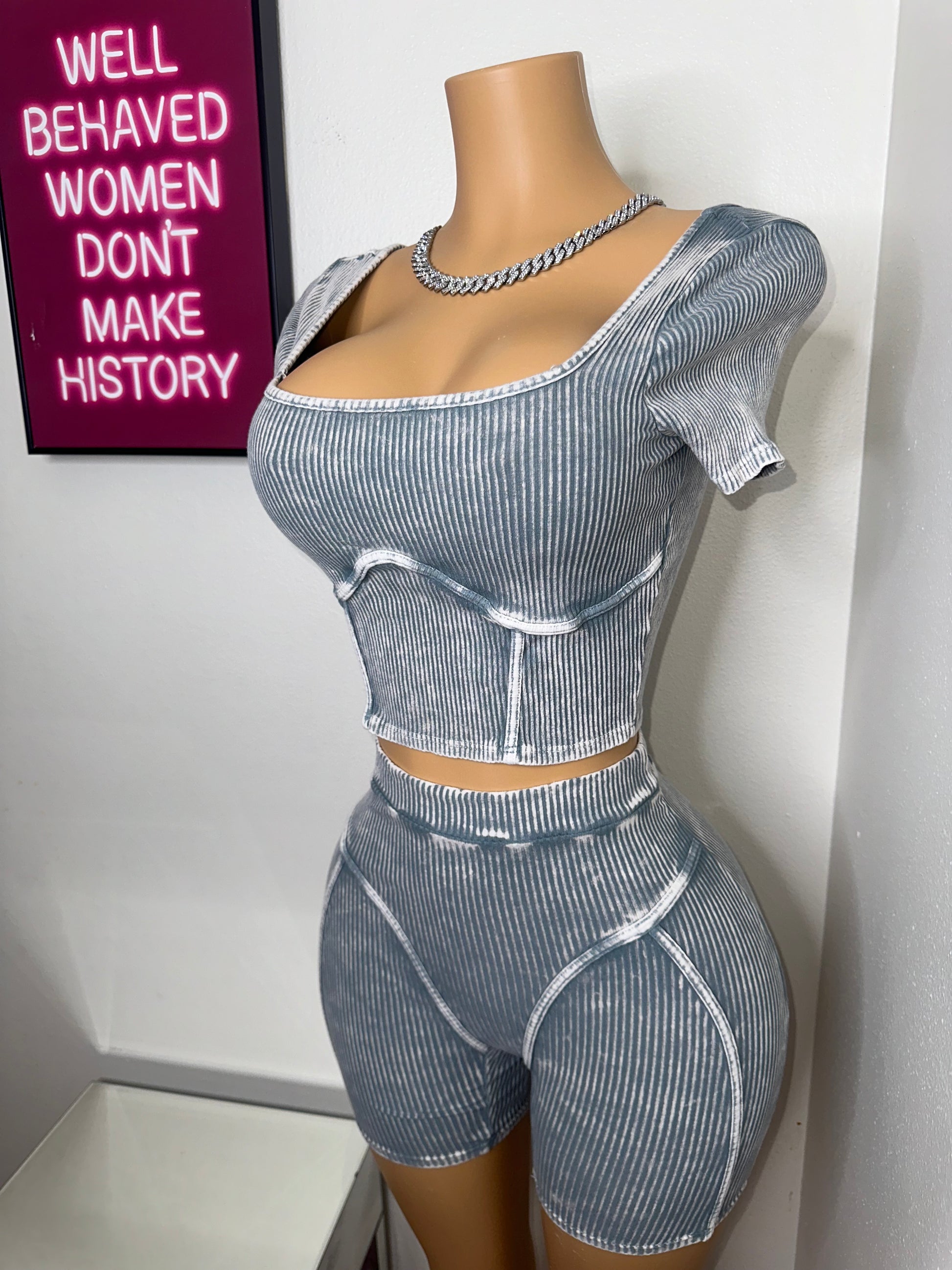 Mannequin wearing a small. Crafted from a blend of 92% polyester and 8% spandex, this two piece set features a solid, mineral wash pattern, a cropped tube top, biker shorts for the bottom, and short sleeves. The slim fit and stretch fabric ensure both comfort and style.