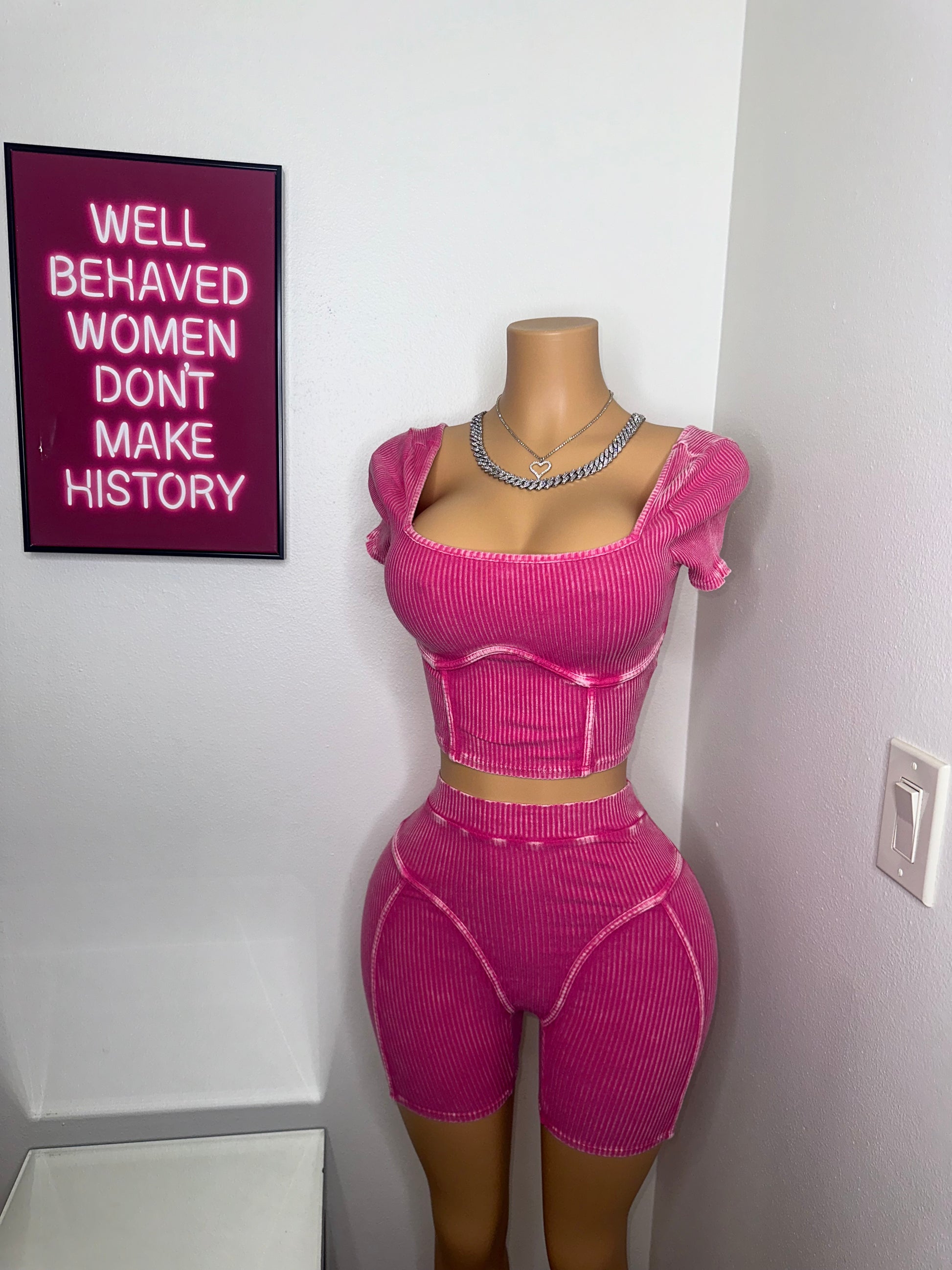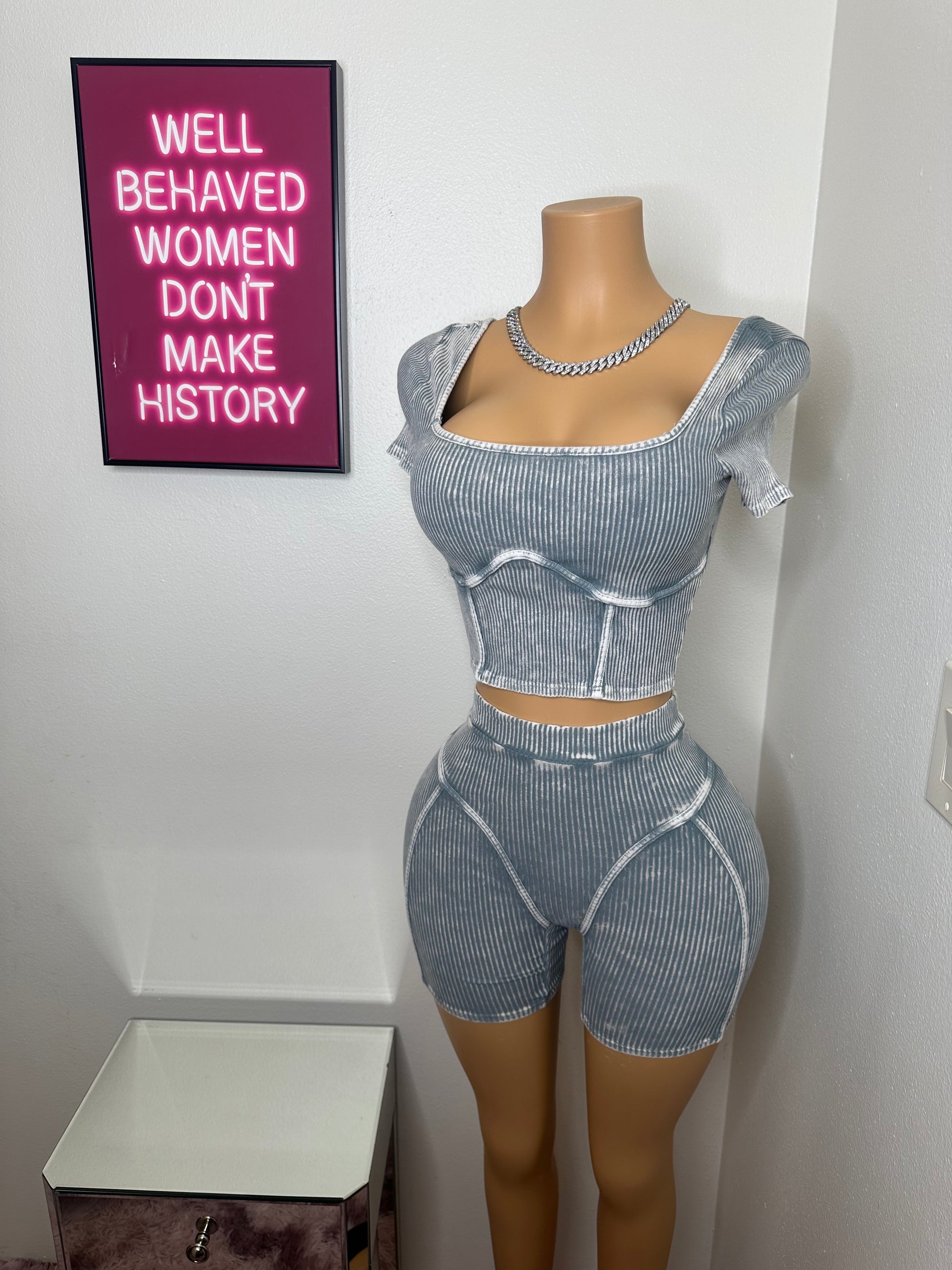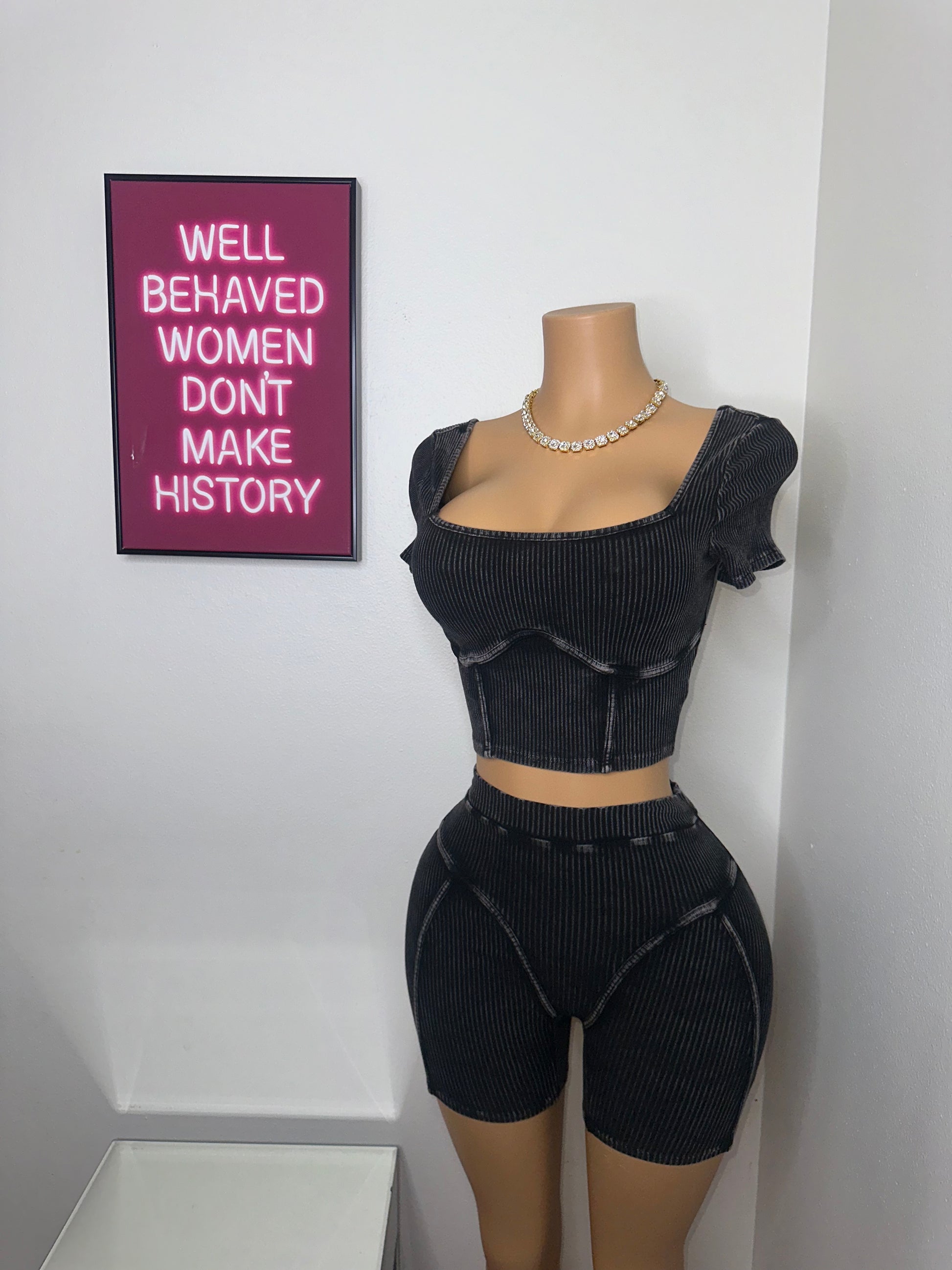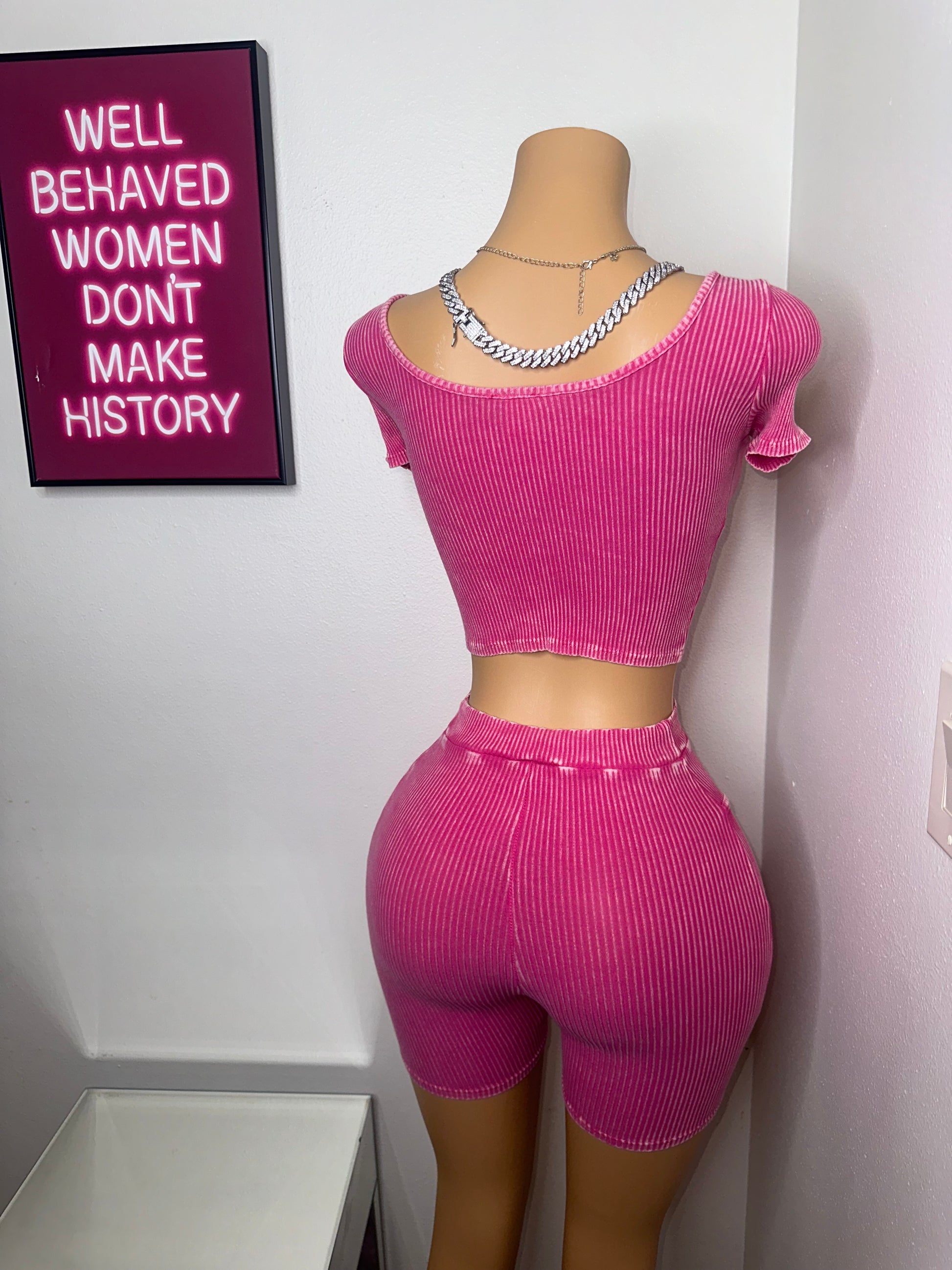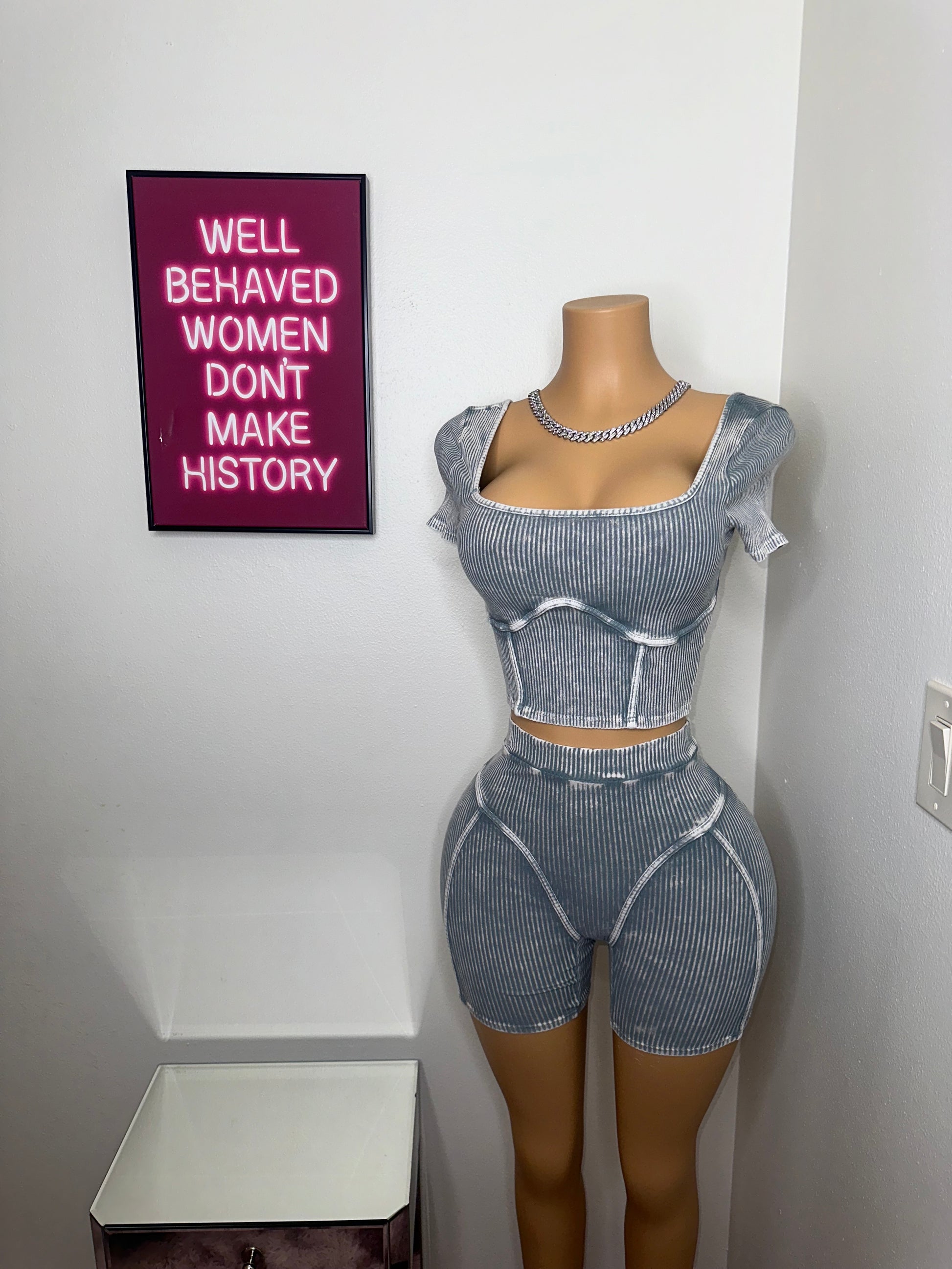 Mannequin wearing a small. Crafted from a blend of 92% polyester and 8% spandex, this two piece set features a solid, mineral wash pattern, a cropped tube top, biker shorts for the bottom, and short sleeves. The slim fit and stretch fabric ensure both comfort and style.