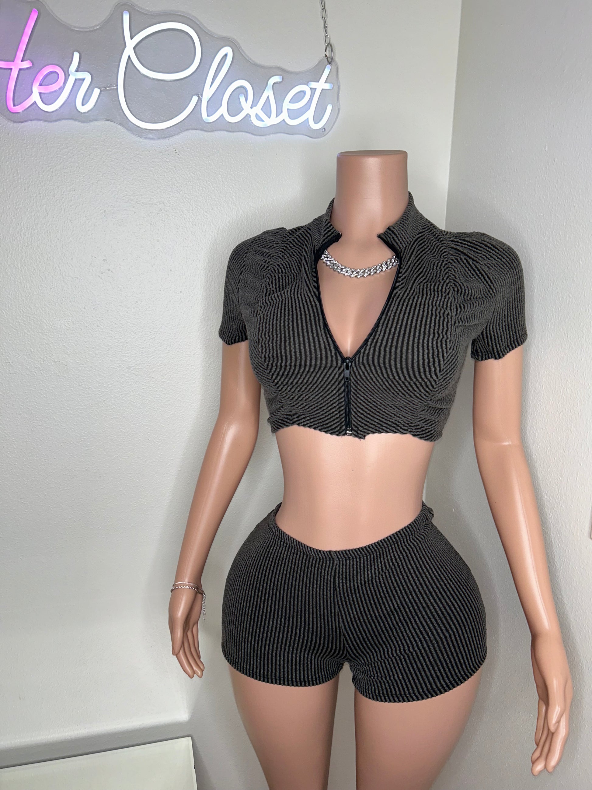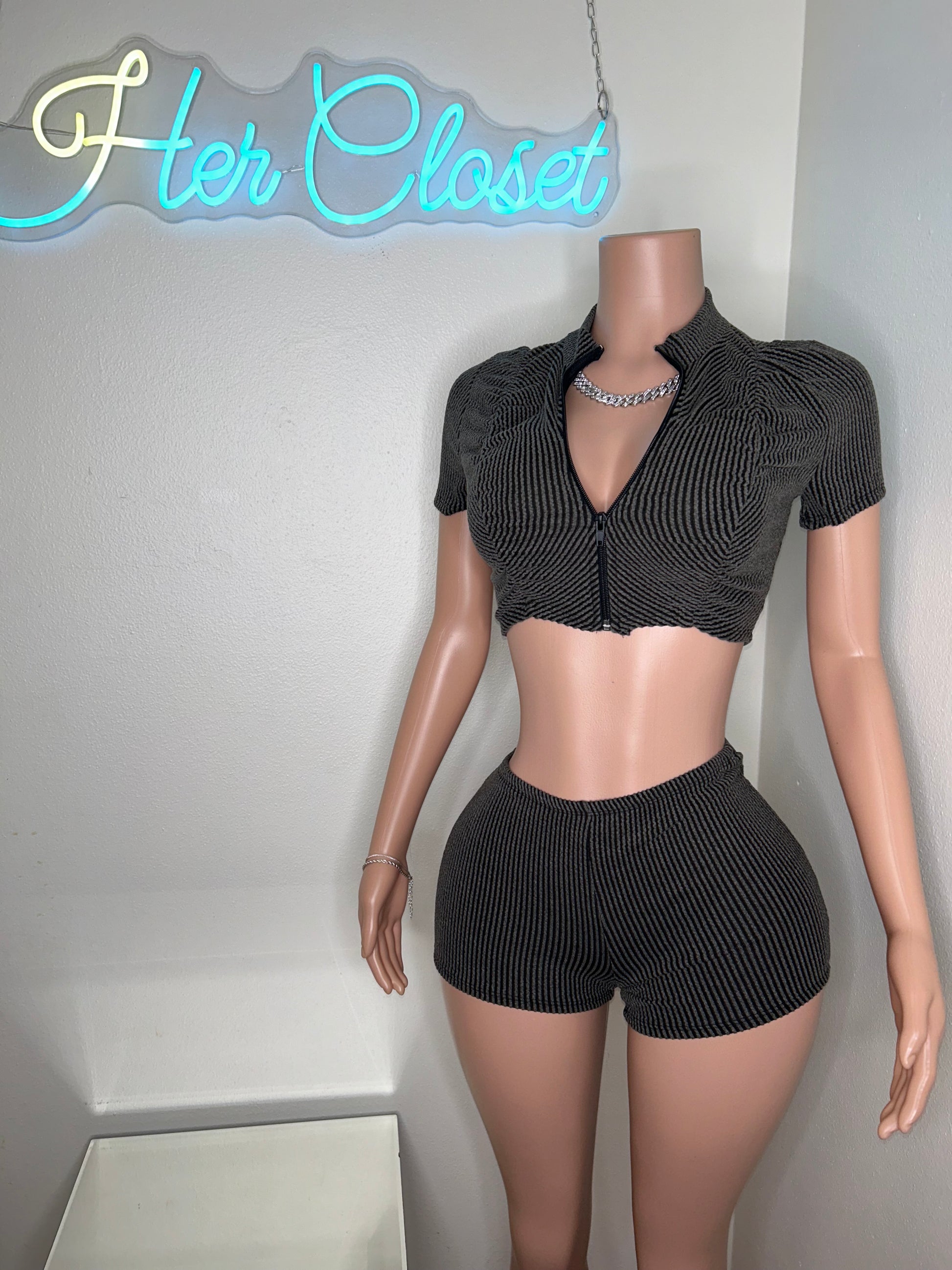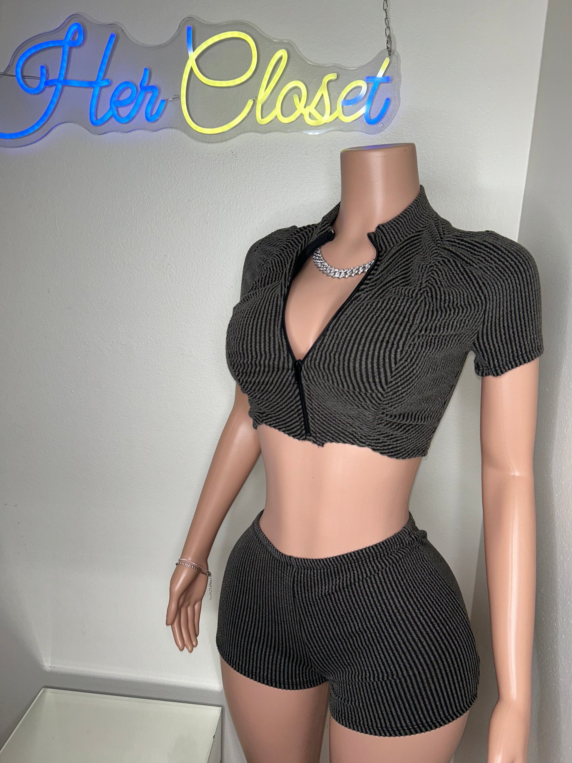 The mannequin is wearing a small size with a front zipper, cropped top, V-neckline, and short sleeves. The fabric is a stretch blend of 92% polyester and 8% spandex, making it both comfortable and stylish.