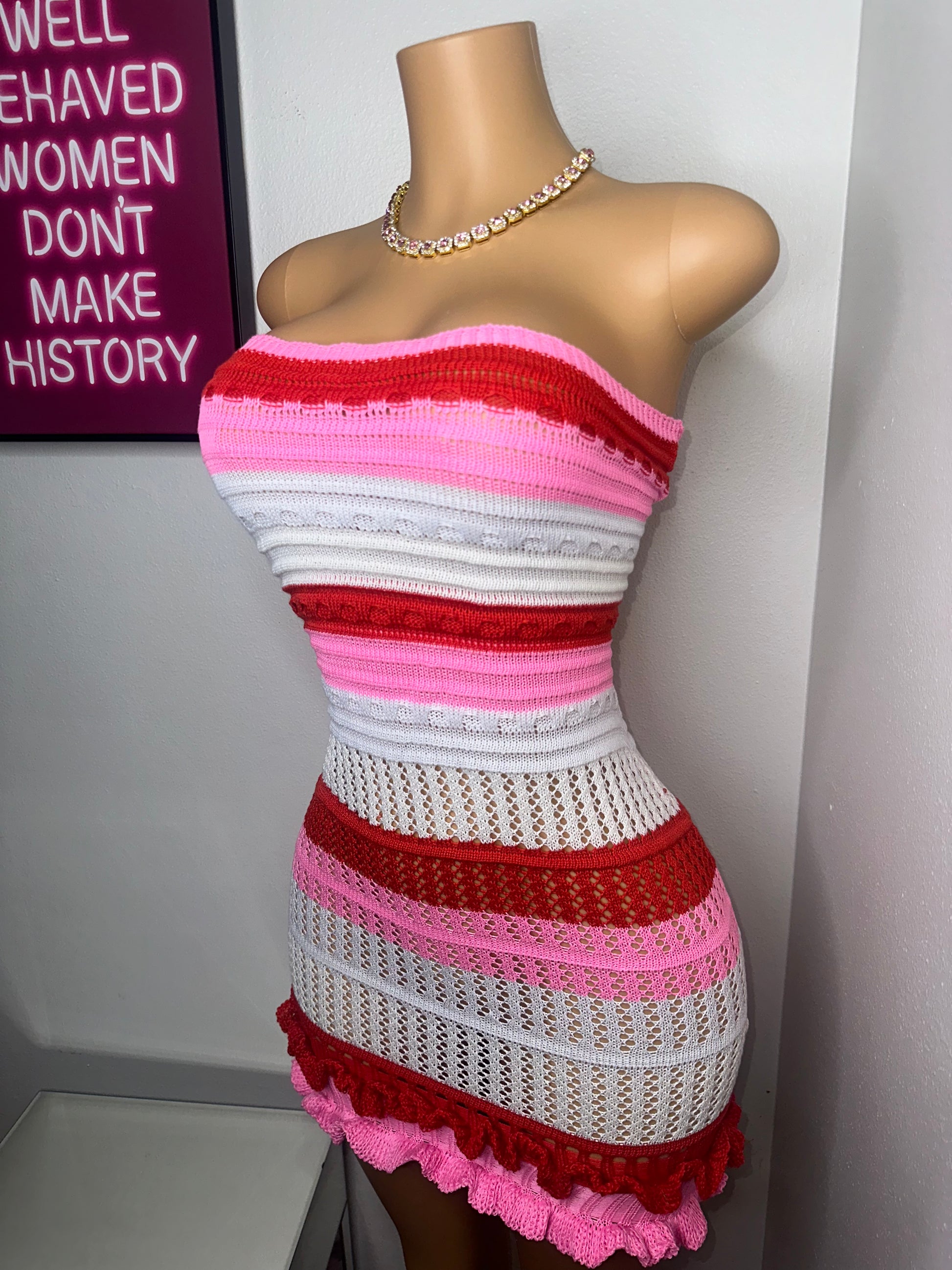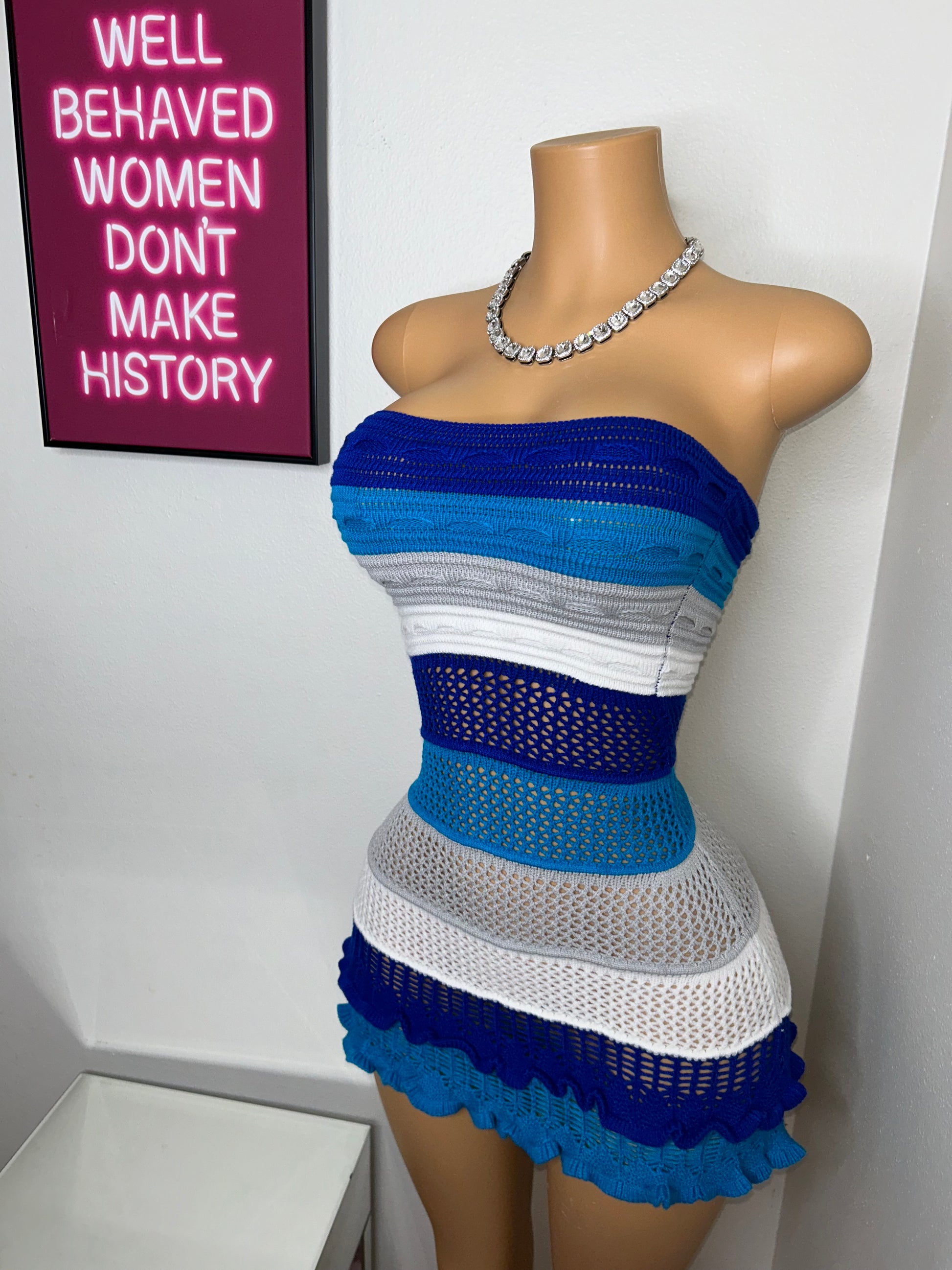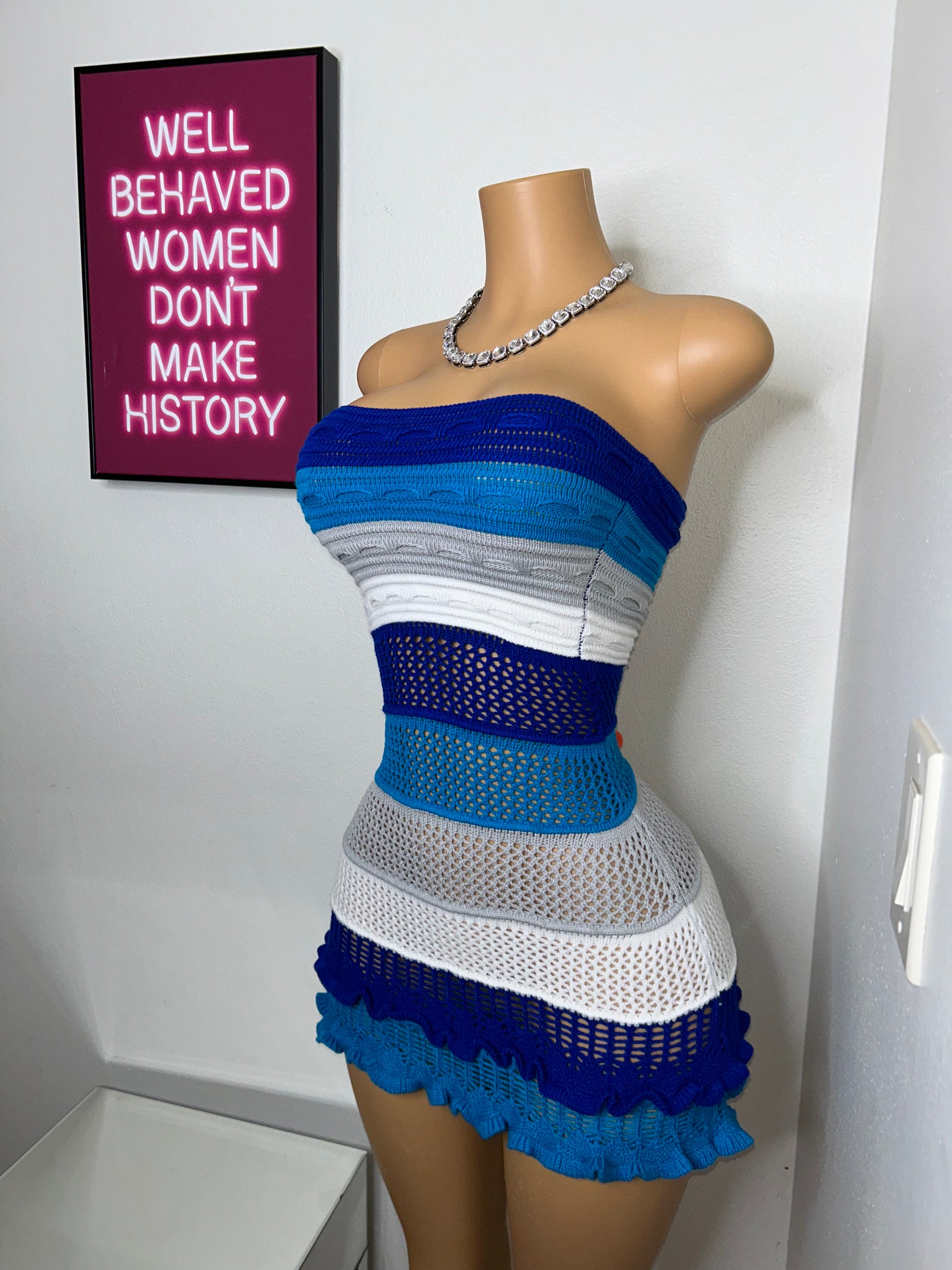- This dress is designed with a stretchy, crochet fabric and features a tube top and sleeveless design. The ruffles add a stylish touch, and it is made of 95% polyester and 5% spandex. It is recommended to hand wash it with cold water.