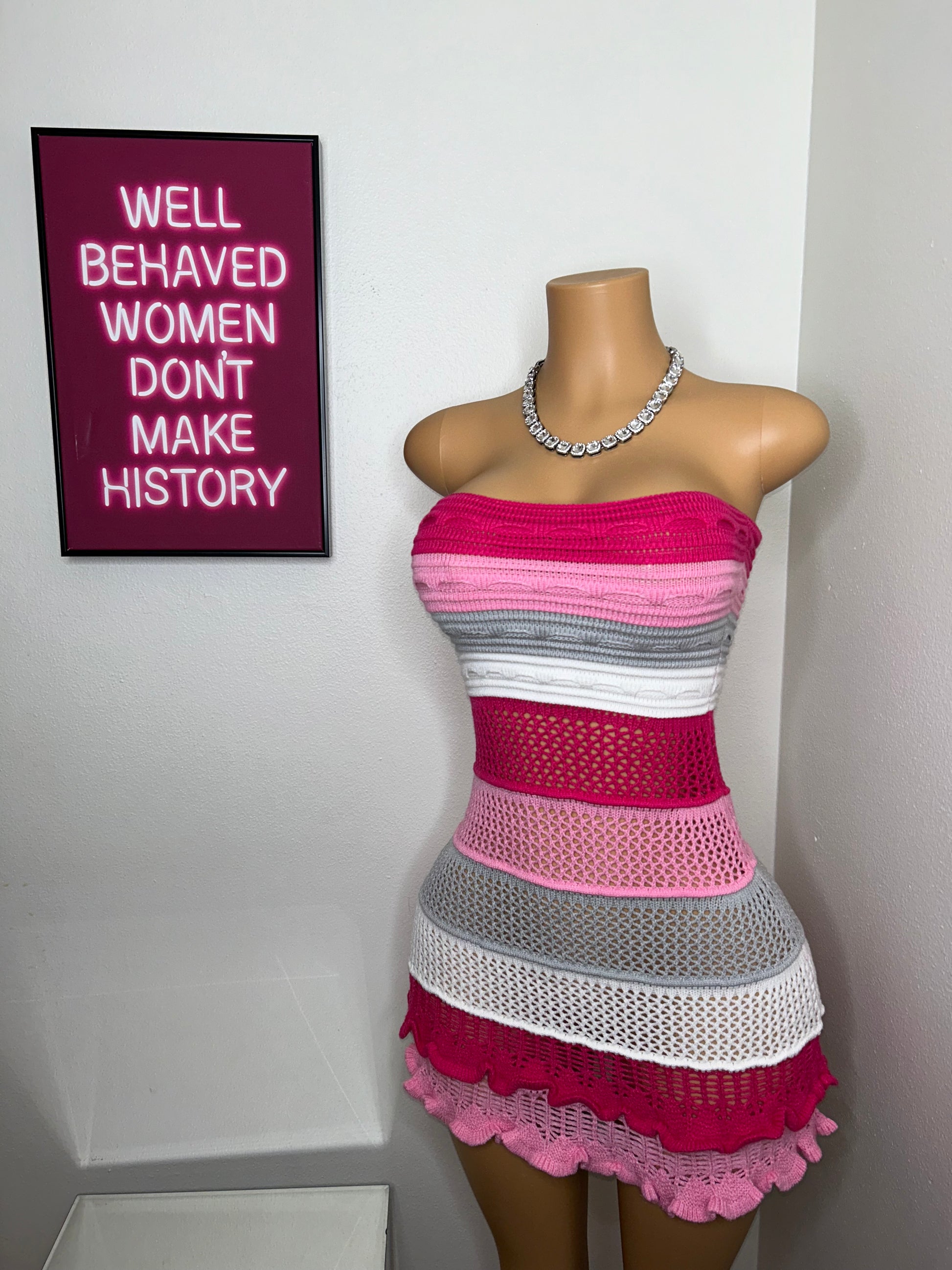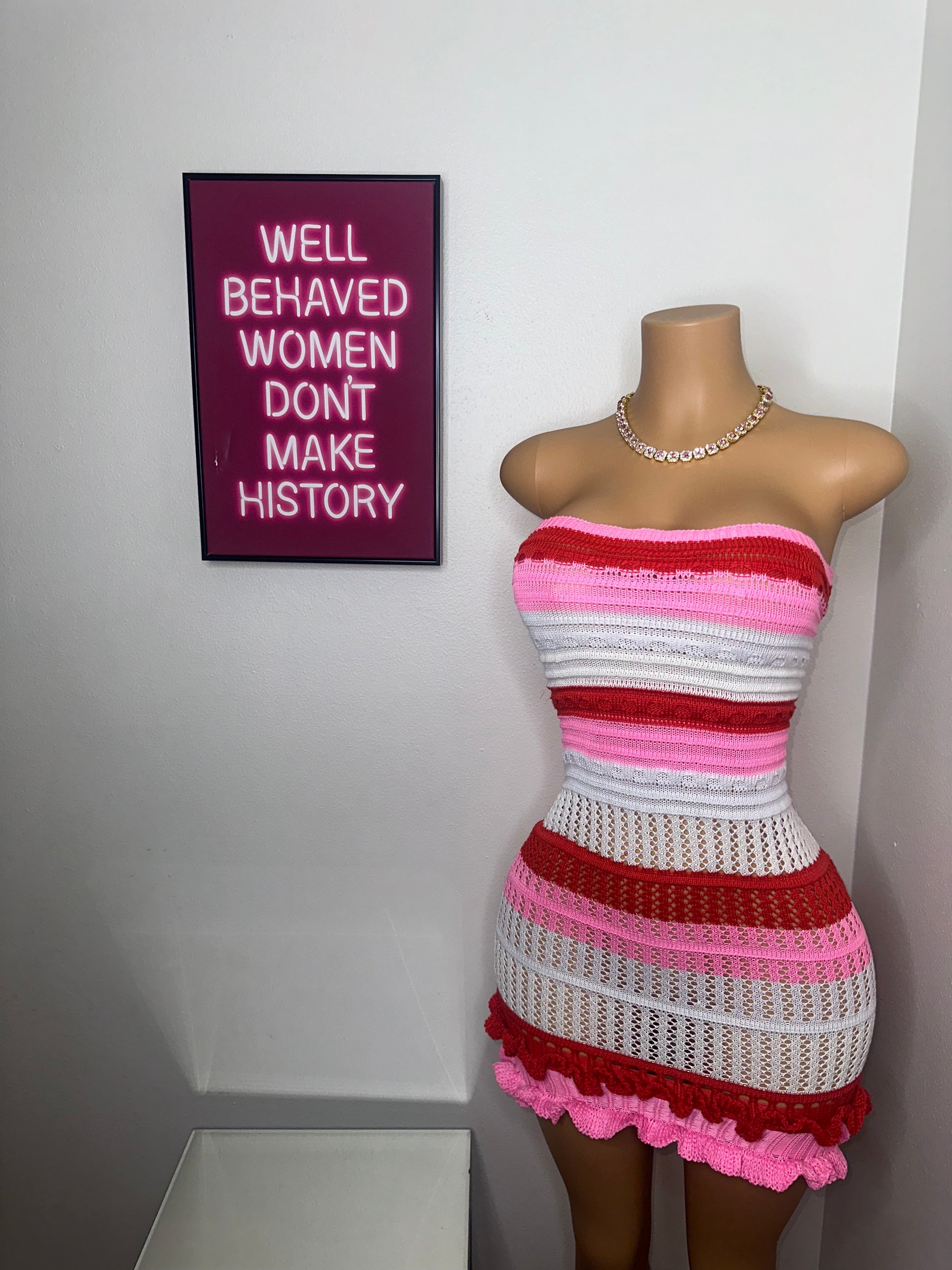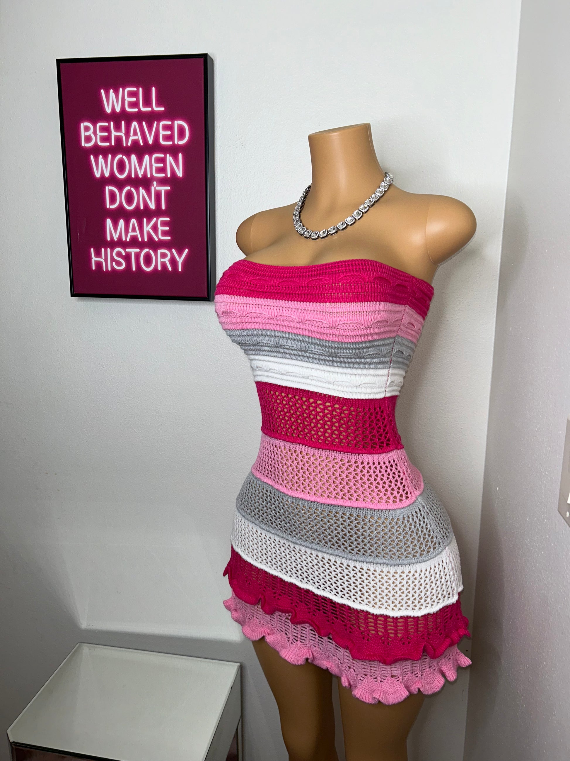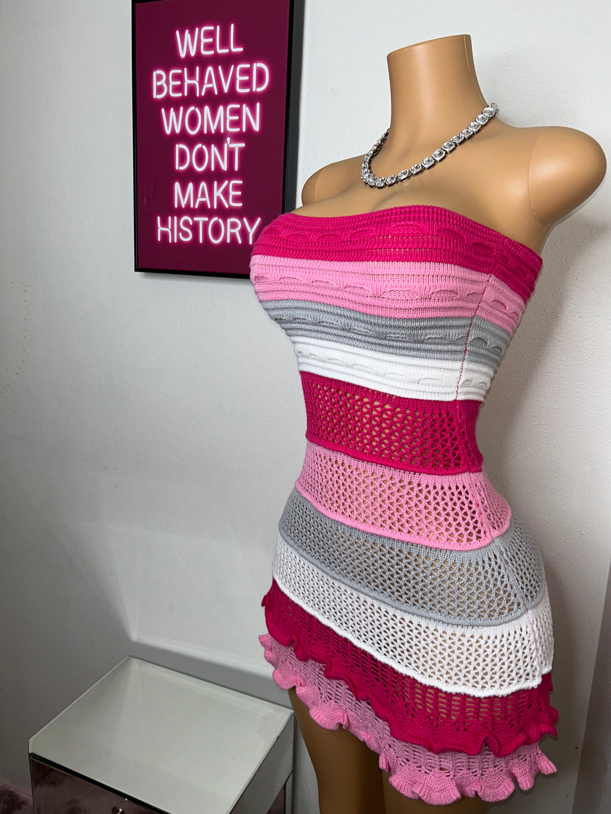 - This dress is designed with a stretchy, crochet fabric and features a tube top and sleeveless design. The ruffles add a stylish touch, and it is made of 95% polyester and 5% spandex. It is recommended to hand wash it with cold water.