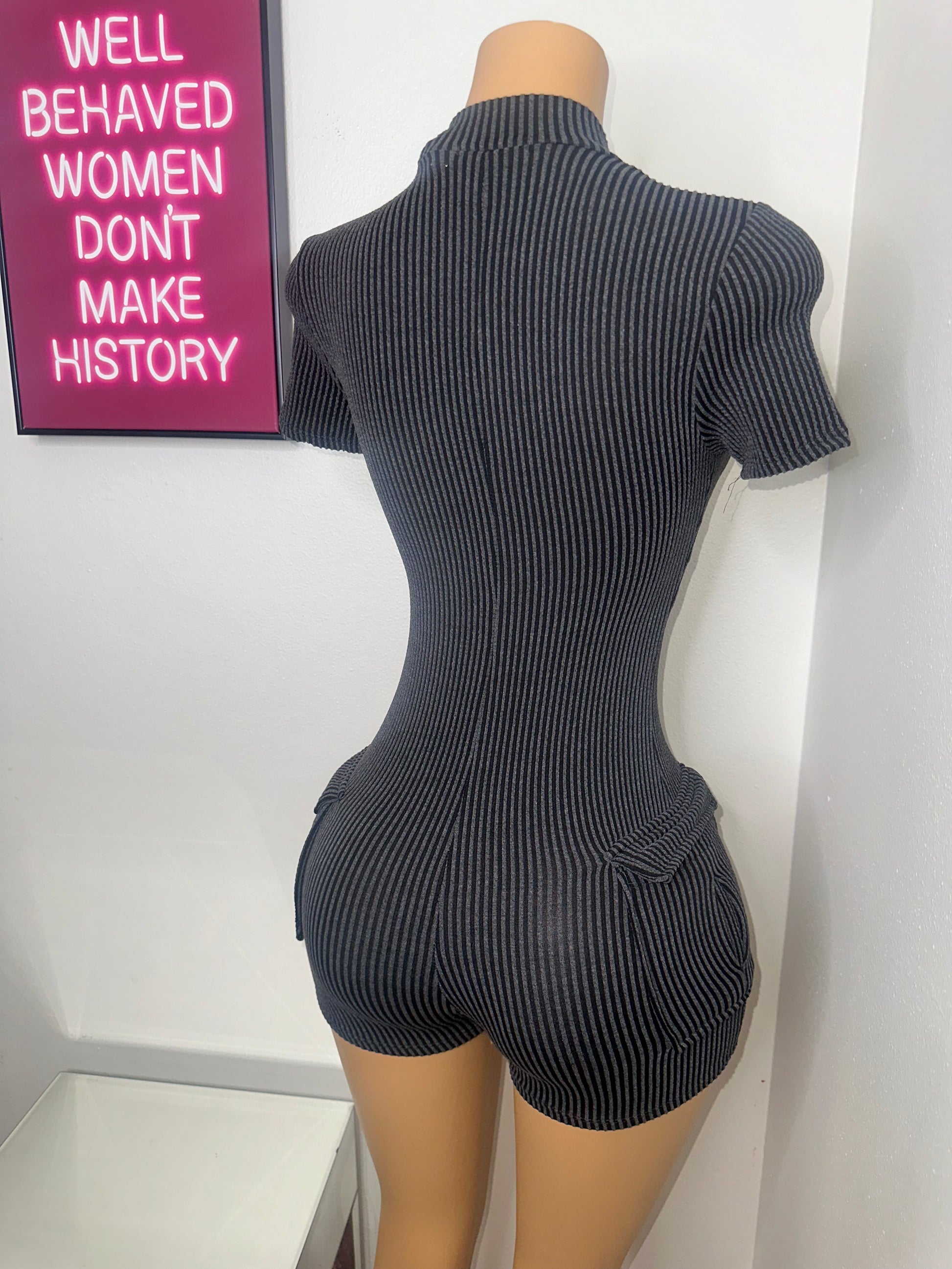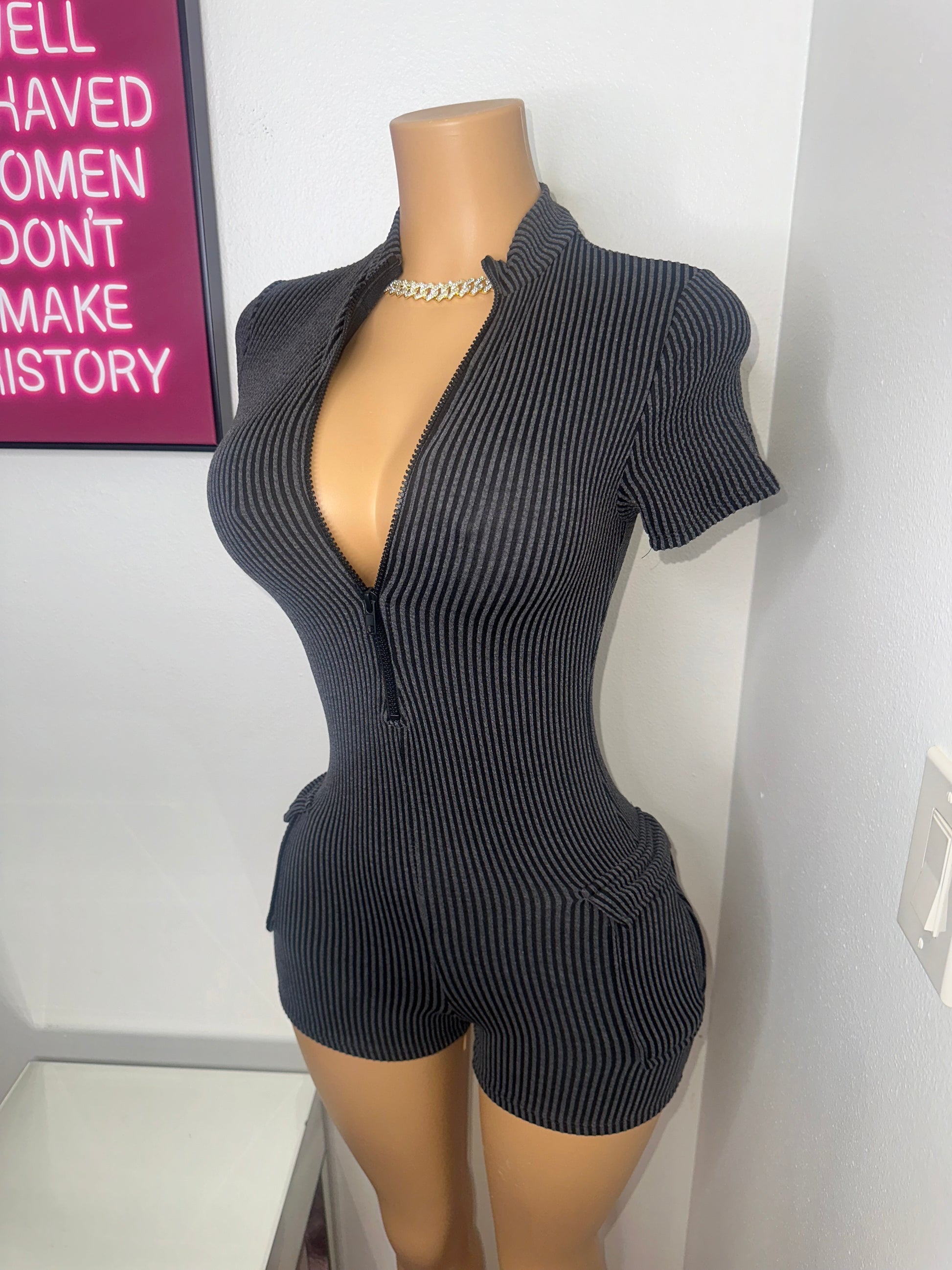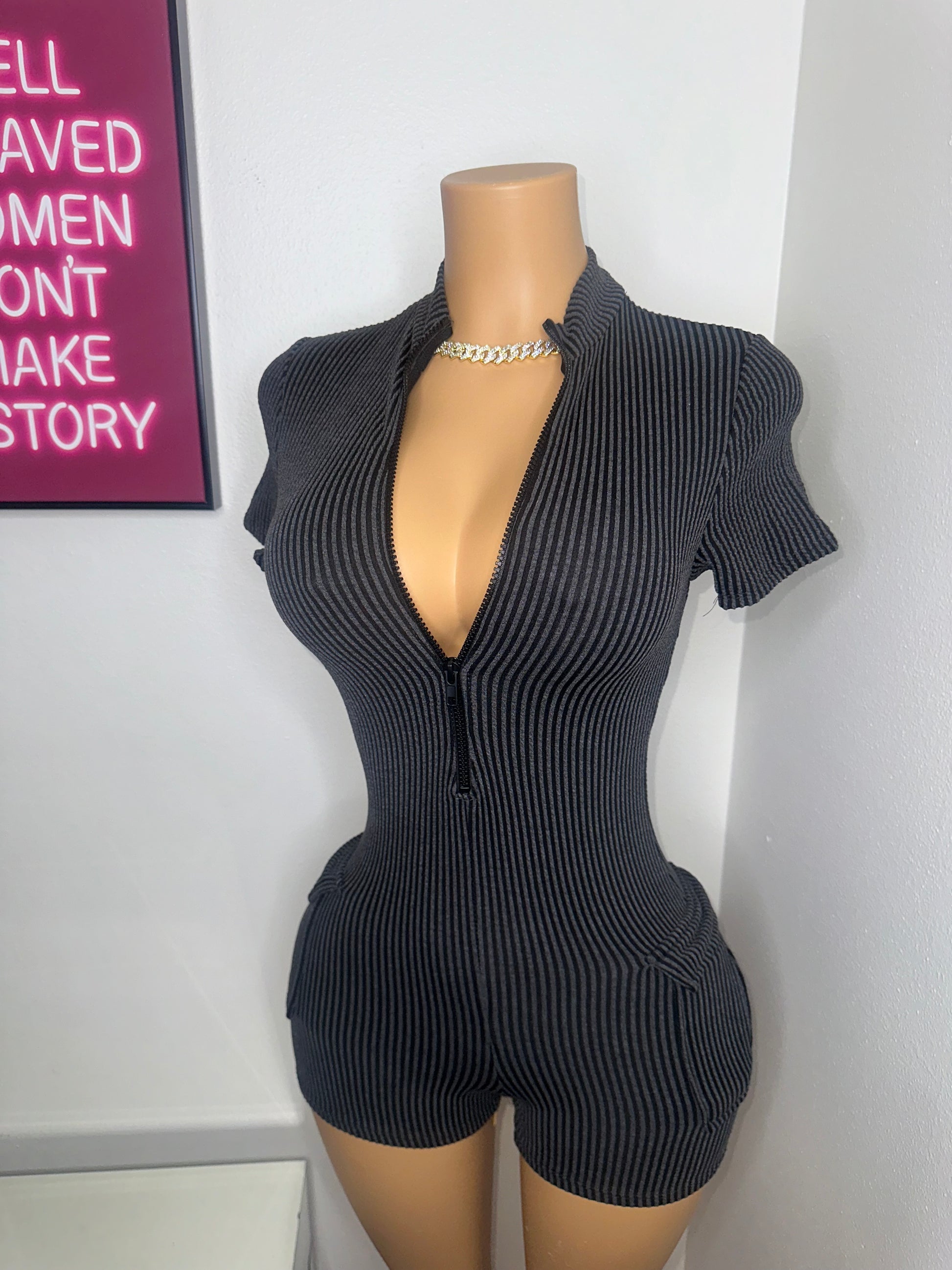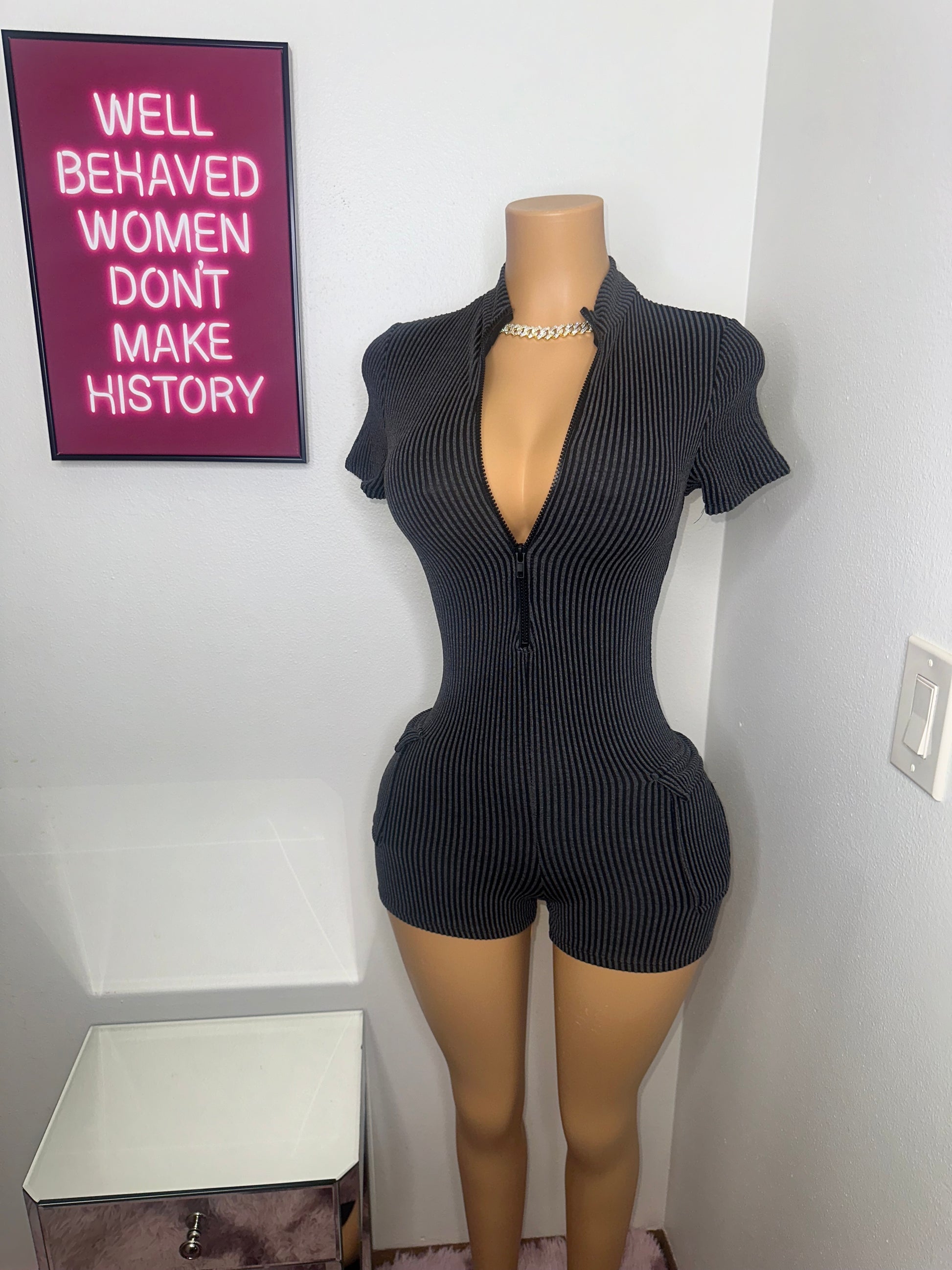 The mannequin is dressed in a size medium and is displaying a stretch romper with a collar, short sleeves, and zipper closure. The garment is made of 76% polyester, 21% rayon, and 3% spandex.