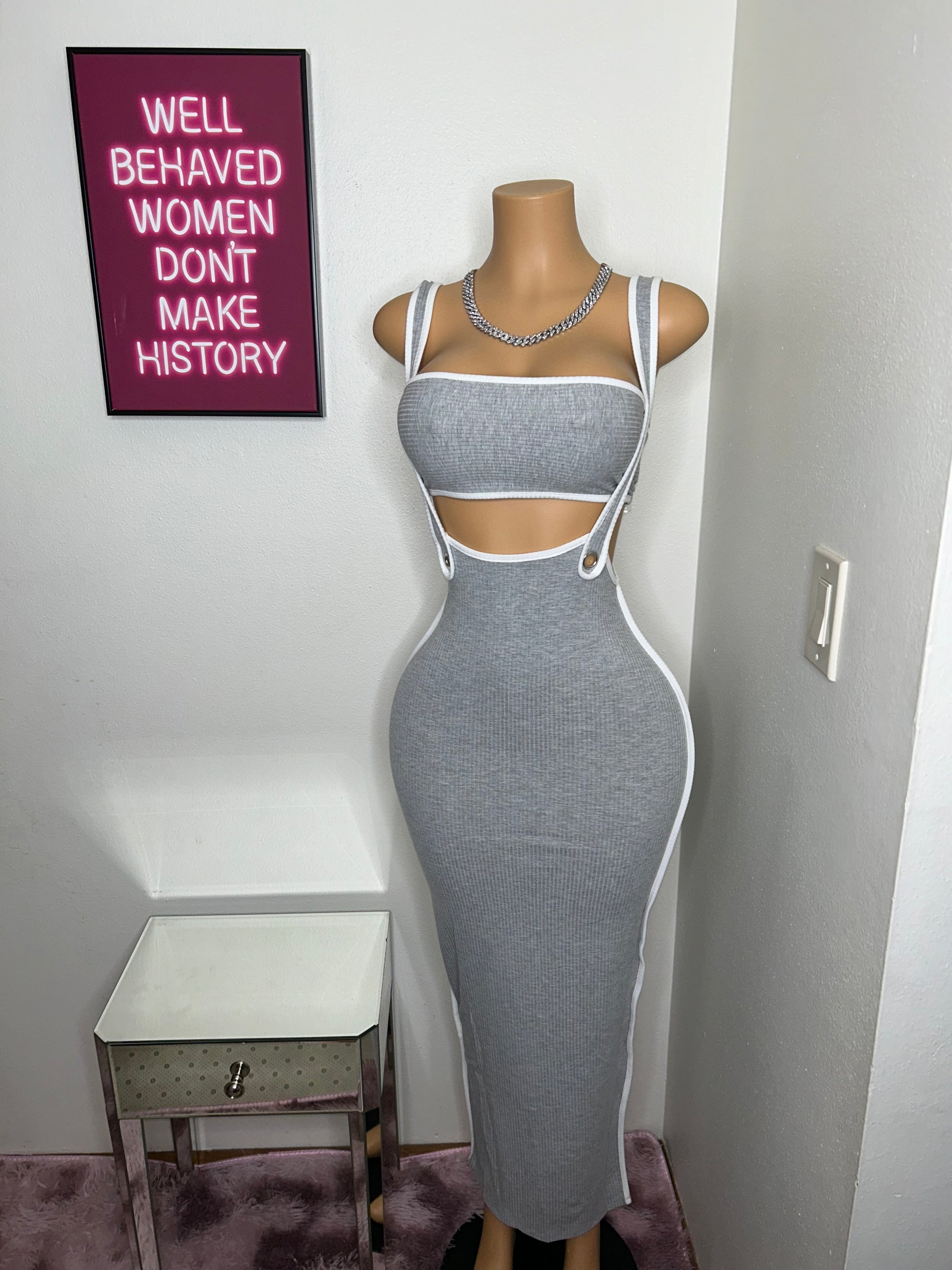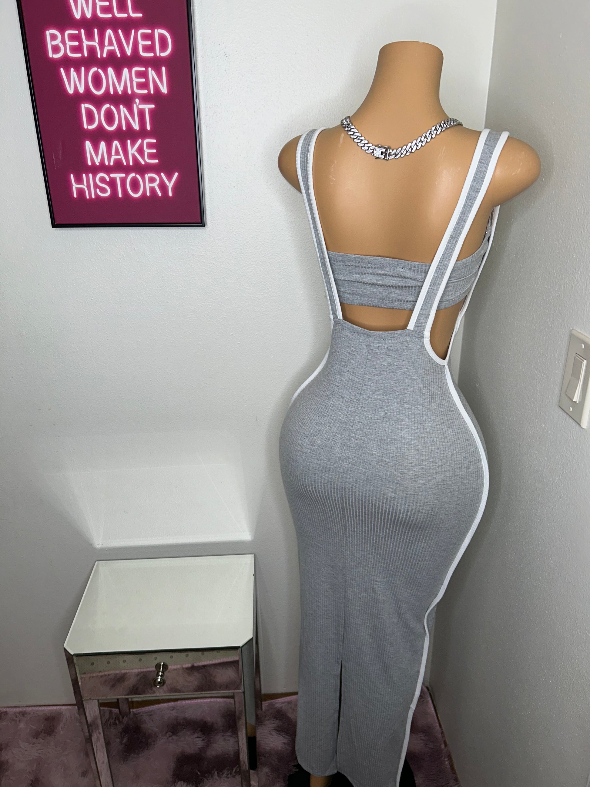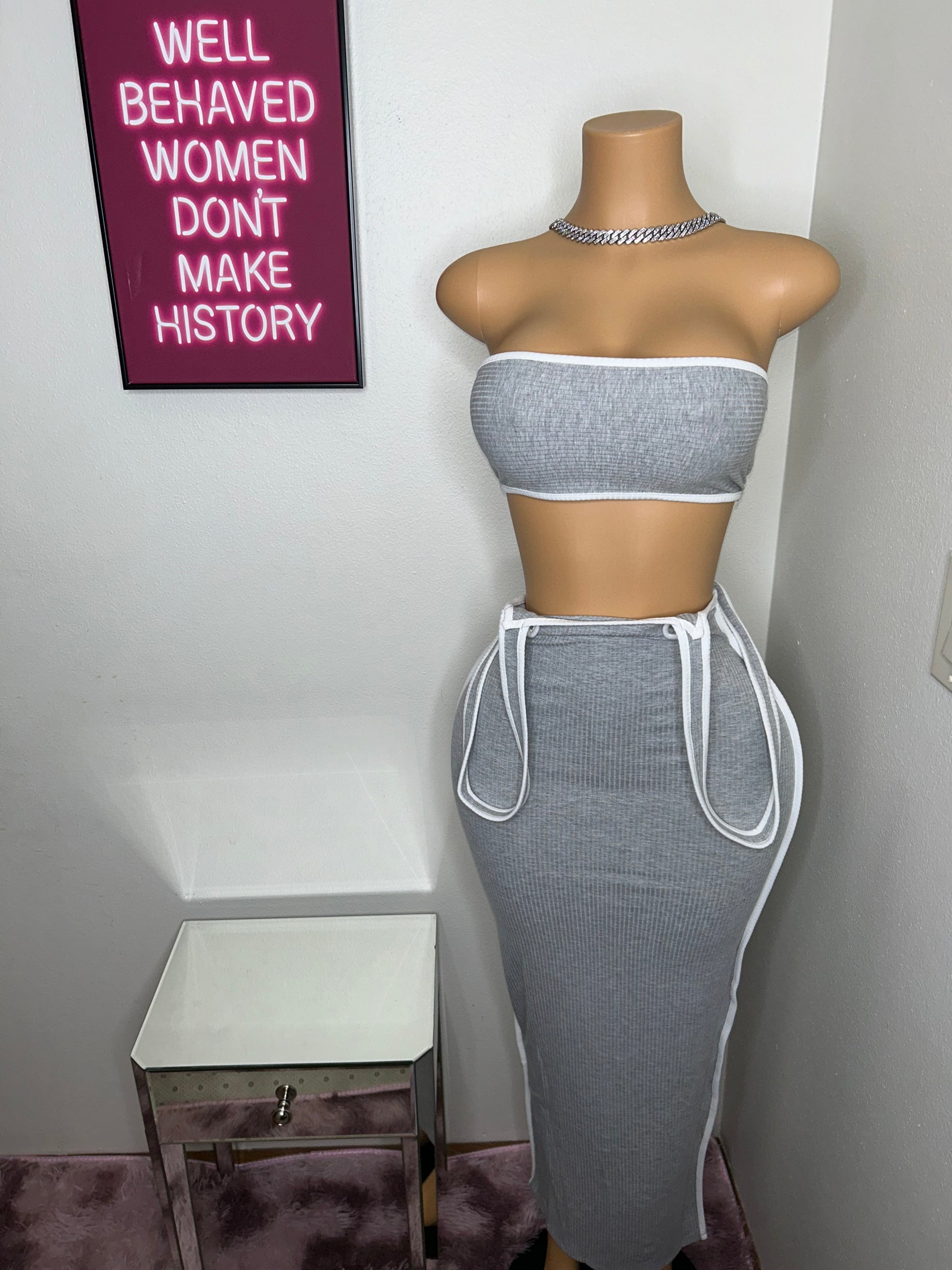 - This garment is a set with a stretchable skirt and a tube top, featuring a slit for a stylish touch. It is made of 95% polyester and 5% spandex, and is recommended to be hand washed in cold water. When worn by the mannequin, the garment is shown in a small size.