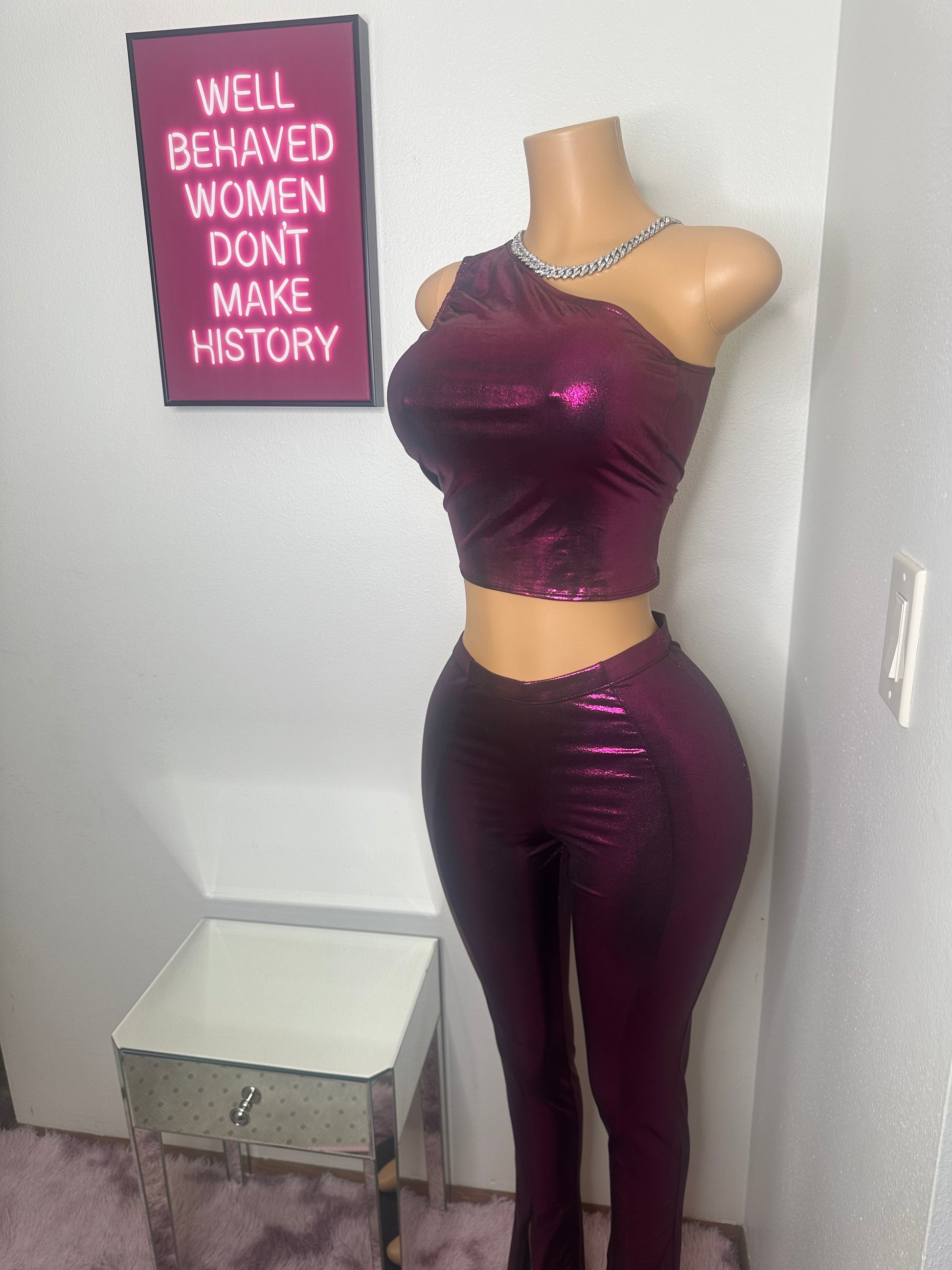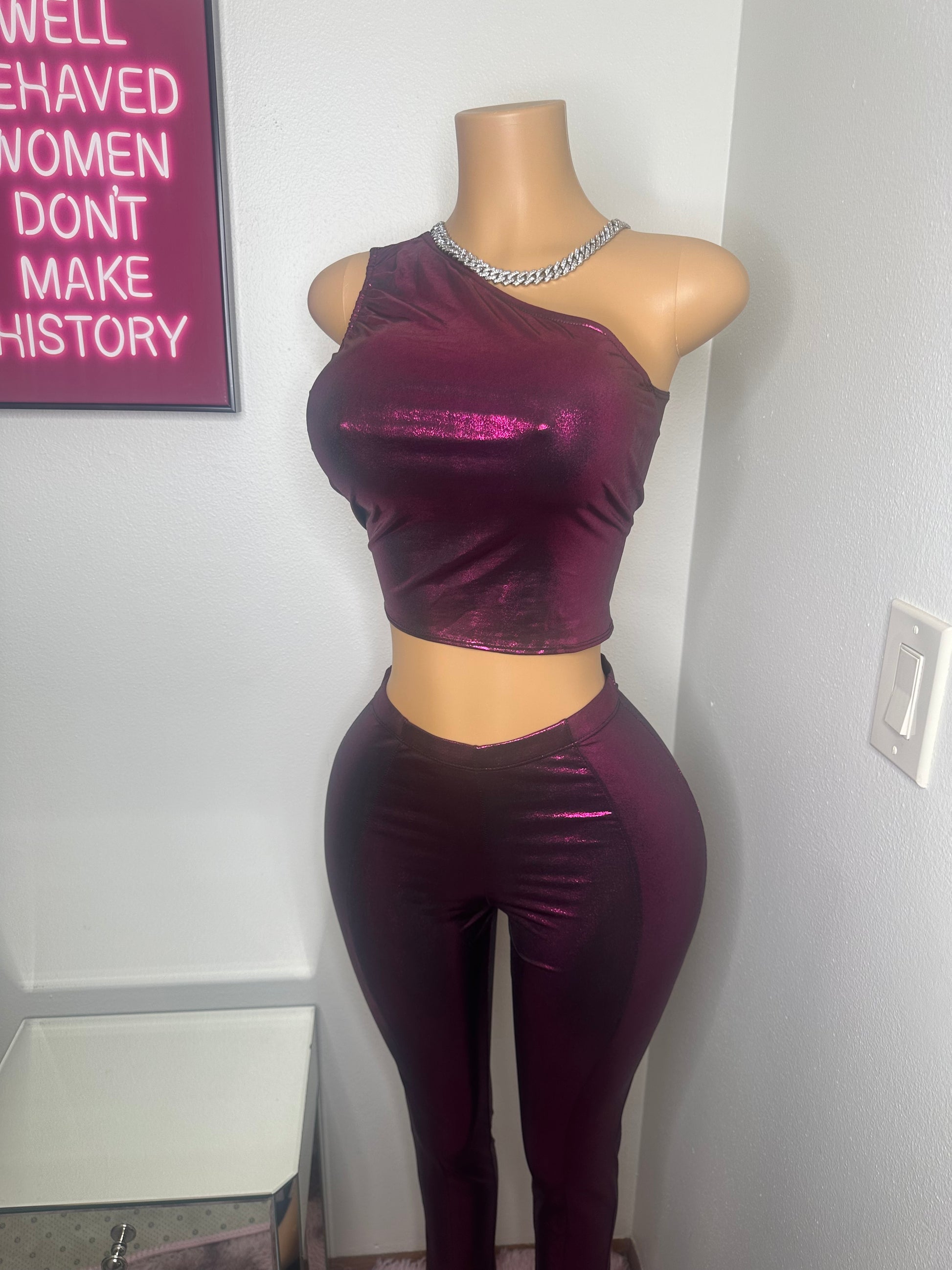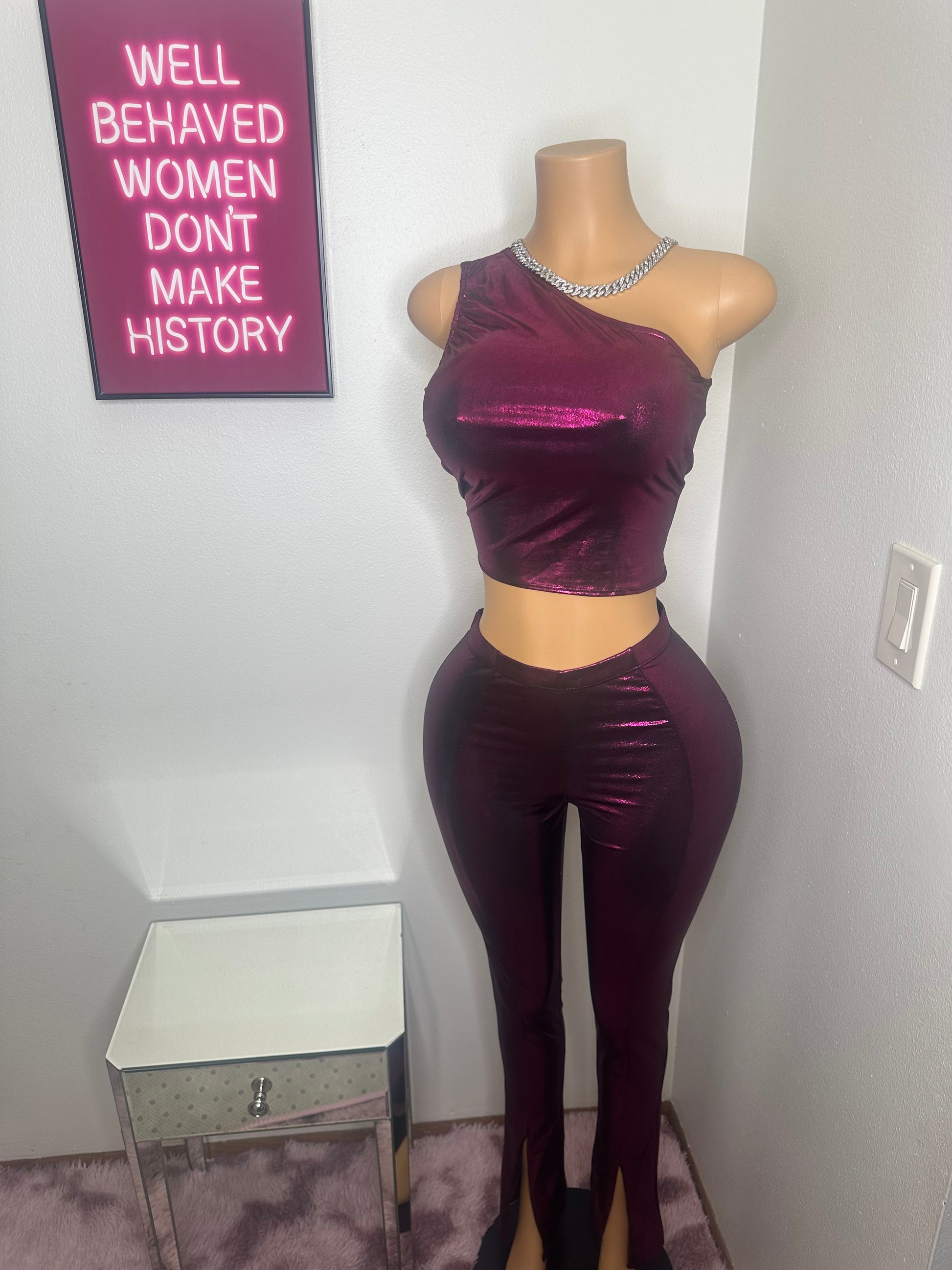 - Metallic One Shoulder Top Ankle Slit Leggings