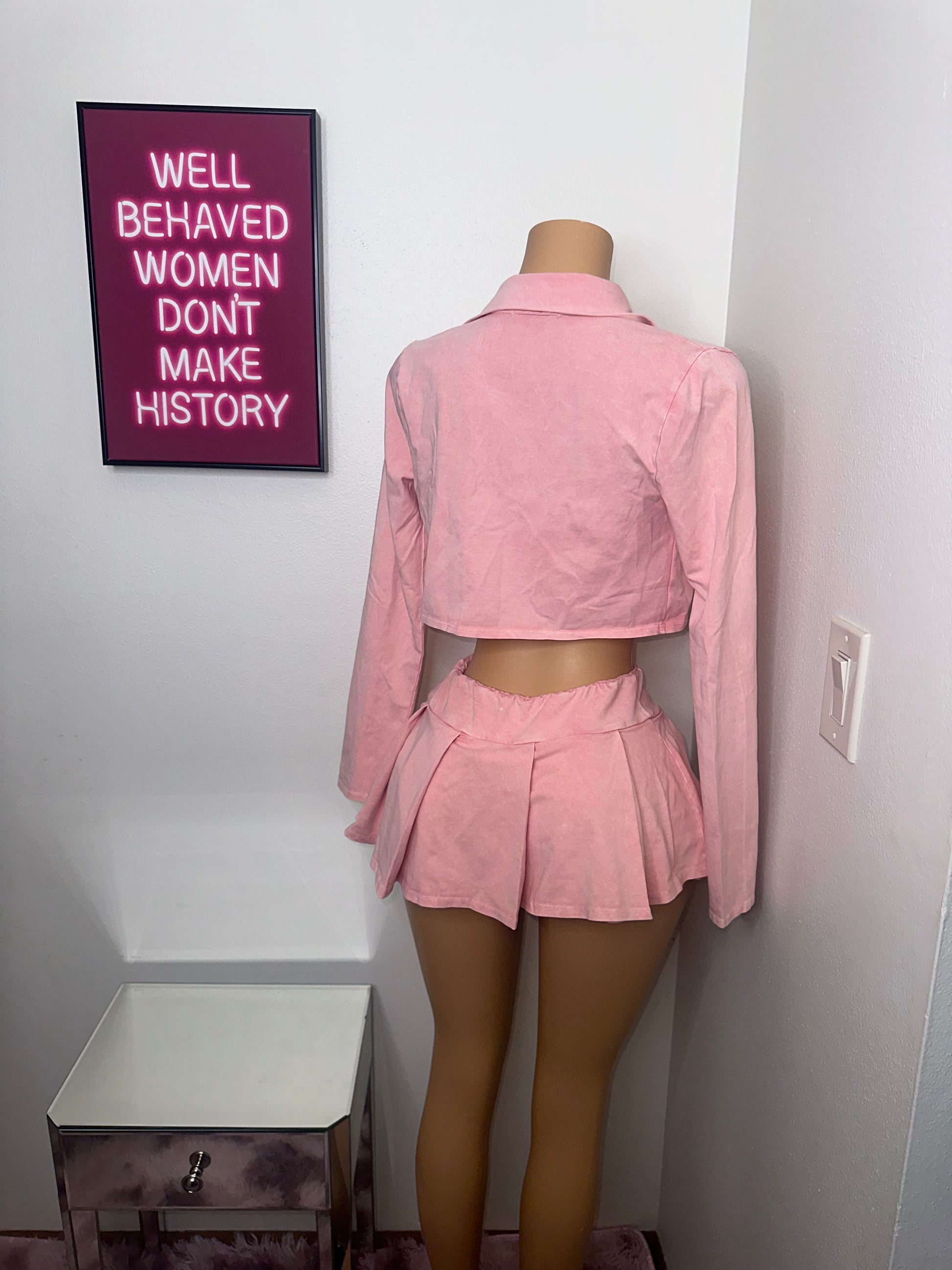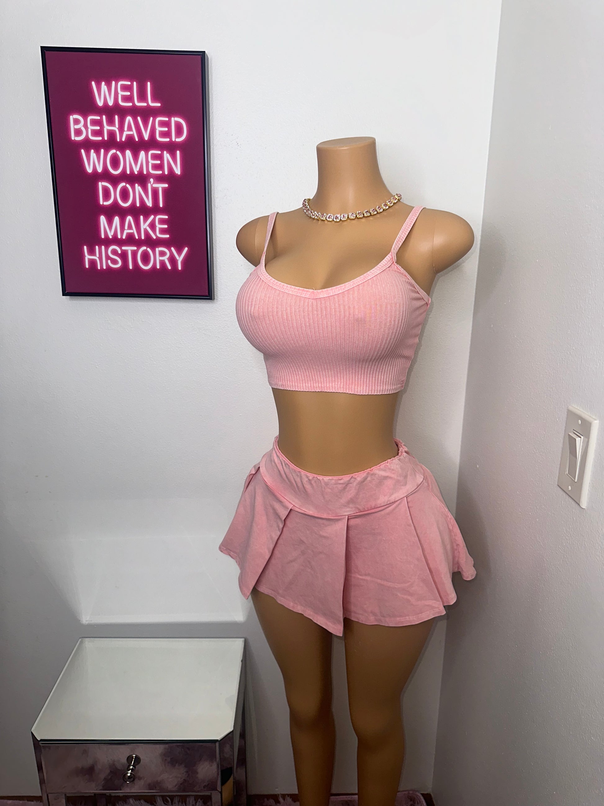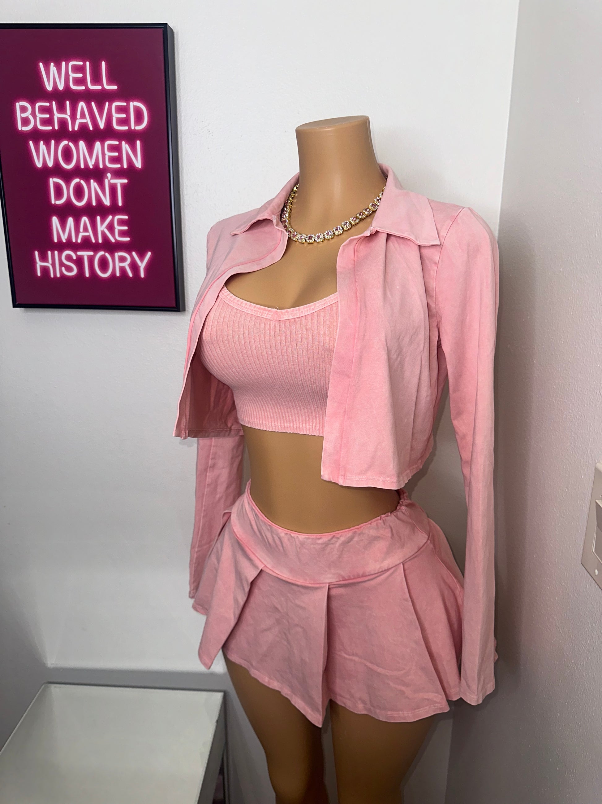 The set features a mannequin wearing a medium-size stretch skirt, including a three-piece ensemble consisting of a tank top, sleeveless V-neck cardigan with collar, and a high-waisted skirt with an elastic waistband. The set also includes a short underlining for added comfort and is made from 95% cotton and 5% spandex. For proper maintenance, it is recommended to hand wash the set in cold water.